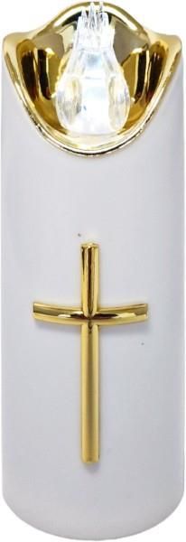Znicz elektryczny LED CORTINA 2/23/LUX WG 15CM BIAŁY Znicz LED CORTINAw kolorze biało-złotym o wysokości 15cm. Znicz najwyższej jakości, nie wydziela CO2.Oferta dotyczy 1szt. znicza wraz z baterią 2xR6. Do znicza dołączamy w formie gratisu baterie (Nie stanowią one podstawy do reklamacji).Dzięki zastosowaniu energooszczędnej technologii led jako źródła światła, prezentuje niesamowity efekt oświetlając dekoracyjną część wkładu . Dzięki uszczelnione obudowie zniesie nawet najcięższe warunki atmosferyczne. Brak żywego ognia powoduje, że znicz jest bezpieczny w użytkowaniu i nie spowoduje oparzeń, ani samoistnych podpaleń.Ekologiczny – jest świetną alternatywą dla zniczy parafinowych lub olejowych, ponieważ nie wydziela CO2 UWAGA: Testy były przeprowadzone w warunkach pokojowych, dlatego czas świecenia wkładów wystawionych na warunki atmosferyczne lub po zastosowaniu gorszej jakości baterii może ulec zmianie. Cortina to renomowana firma specjalizująca się w produkcji oraz dystrybucji zniczy i wkładów do zniczy. Dzięki wieloletniemu doświadczeniu na rynku, firma zyskała opinię solidnego i zaufanego partnera, oferującego wysokiej jakości produkty, które łączą estetykę z funkcjonalnością. Cortina w swojej ofercie posiada szeroką gamę zniczy, od klasycznych po nowoczesne modele, dostosowane do różnych okazji i gustów klientów.