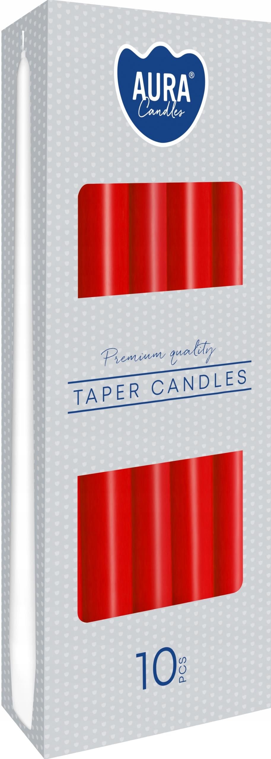 Świece stołowe czerwone dla wyjątkowego wnętrza Świece stołowe Aura w kolorze czerwonym są niezmiennie eleganckim elementem dekoracyjnym, zdolnym urozmaicić każde wnętrze swoim wyjątkowym urokiem. Są szczególnie wyjątkowe jako dodatek do przyjęć o charakterze okazjonalnym oraz jako ozdoba w stroikach czy kompozycjach. Wspaniale współgrają z innymi elementami dekoracyjnymi, takimi jak kwiaty, gałązki, szyszki, czy ozdoby, co umożliwia tworzenie niepowtarzalnych i efektownych aranżacji na stołach, kominkach, czy innych powierzchniach. Świece stołowe wyróżniają się swoim charakterystycznym stożkowym kształtem oraz głębokim, mocnym czerwonym kolorem, który skupia uwagę i nadaje wyjątkowej atmosfery. Dzięki swojemu designowi stanowią punkt centralny dekoracji, przyciągając wzrok i dodając elegancji. Dekoracyjne stożkowe świece - Zestaw 10 czerwonych świec stołowych Bez wątpienia, ich bezzapachowy charakter jest zaletą, pozwalającą na swobodne łączenie z innymi aromatami czy zapachami w pomieszczeniu. Precyzyjne wymiary świec stołowych – długość 24,5 cm oraz średnica 2,3 cm – nadają proporcje, które sprawiają, że są doskonale zrównoważone i stabilne. Opakowanie, w jakim świece są dostarczane, stanowi dodatkowy element estetyczny, podkreślając luksusowy charakter produktu. Kartonik, w którym znajduje się 10 sztuk, nie tylko chroni je przed uszkodzeniami, ale również nadaje im ekskluzywny wygląd, co może być istotne szczególnie podczas wyjątkowych okazji czy eventów. Świece o czasie palenia do 7 godzin. Wybór czerwonego koloru dla tych stożkowych świec jest znaczący, gdyż niesie ze sobą symbole miłości, pasji, energii oraz radości. Ten kolor jest uniwersalny i doskonale sprawdza się zarówno podczas romantycznych kolacji, świąt, jak i innych wydarzeń, w których pragniemy wprowadzić ciepłą i efektowną aurę. Czerwień świetnie komponuje się z innymi elementami dekoracyjnymi, takimi jak kwiaty, serwetki, obrusy, czy ozdobne podstawki, tworząc harmonijną całość. Technologia produkcji świec gwarantuje, że nie kapią woskiem i nie wydzielają dymu, co sprawia, że ich użytkowanie jest komfortowe i bezproblemowe. Spalają się równomiernie, co przyczynia się do zachowania estetycznego wyglądu oraz trwałości dekoracji. Ta cecha jest istotna, zwłaszcza w sytuacjach, gdy chcemy cieszyć się atmosferą świec bez obaw o ewentualne plamy czy niepożądane uciążliwości.
