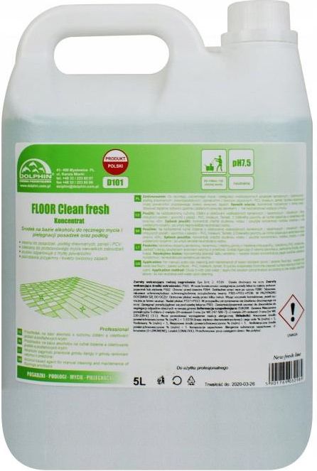 Dolphin Floor Clean Fresh - Środek na bazie alkoholu do ręcznego mycia i pielęgnacji posadzek oraz podłóg 5L, zapach owocowy Floor Clean Fresh to płyn przeznaczony do ręcznego, codziennego mycia podłóg o pięknymowocowym zapachu. Idealnie sprawdzi się na wszelkiego rodzaju posadzkach, podłogach drewnianych i drewnopodobnych oraz powierzchniach z tworzyw sztucznych. Zalecany do podstawowego mycia niewielkich zabrudzeń. Dlaczego warto kupić płyn Floor Clean Fresh? posiada bardzo dobre właściwości myjące wydajny - wystarczy niewielka ilość do efektywnego działania pielęgnuje czyszczone powierzchnie nadaje połysk bezpieczny pozostawia świeży, owocowy zapach po użyciu Pojemność 5L. Sposób użycia: Stosować w rozcieńczeniach: 50 do 100ml / 10l wody, w zależności od stopnia zabrudzenia posadzki. pH 7,5 Produkt wyprodukowany w Polsce.