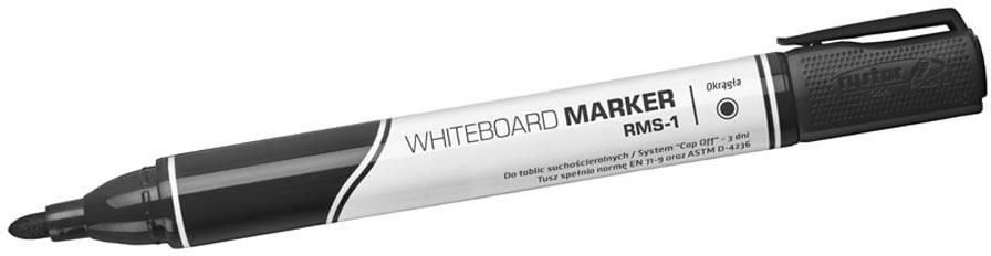 MARKER SUCHOŚCIERALNY CZARNY RYSTOR RMS Marker suchościeralnych Rystor RMS-1 Profesjonalny marker do tablic suchościeralnych wyposażony w okrągłą fibrową końcówkę piszącą Łatwo wymazywalny z tablicy Tusz spełnia normę EN 71-9 oraz ASTM D-4236 oraz posiada trzydniowy system cap-off Cechy: - końcówka okrągła o szerokości: 4mm - długość linii pisania: do 1200m - kolor tuszu: czarny -przeznaczenie: papier plastik karton tablice suchościeralne