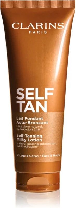 Clarins Self Tan Self-Tanning Milky Lotion, 125 ml, Samoopalacze dla kobiet, Chcesz olśnić pięknie opalonym ciałem, ale nie chcesz czekać na mocniejsze słońce lub moment, kiedy będziesz mogła wyjechać na urlop do ciepłych krajów? Preparat samoopalający do ciałaClarins Self Tan Self-Tanning Milky Lotion zapewni Twojej skórze idealną, równomierną i naturalnie wyglądającą opaleniznę, niezależnie od tego gdzie się z znajdujesz oraz w jakim czasie. Pomoże Ci w łatwy i szybki sposób osiągnąć piękny odcień jak znad morza, bez narażania skóry na promieniowanie słoneczne. Właściwości: nadaje skórze brązowy odcień daje efekt naturalnej opalenizny łatwo się stosuje można używać na twarz i ciało nawilża i wzmacnia Sposób użycia: Nanieś umiarkowaną ilość preparatu na skórę całego ciała. Dokładnie i równomiernie rozetrzyj. Aby uzyskać najlepszy efekt, stosuj rękawiczki do aplikacji. Postępuj zgodnie z załączoną instrukcją. Po użyciu dokładnie umyj ręce.