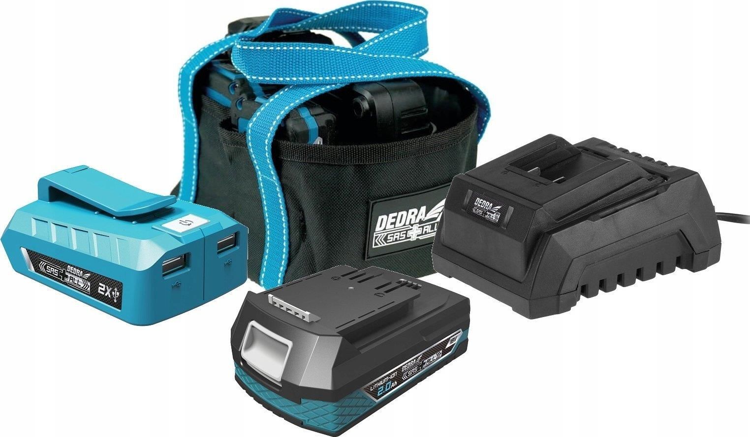 ZESTAW STARTOWY DEDRA SAS+ALL Akumulator 2Ah Adapter ładowarka USB Ładowarka 18V Torba 20x14x10cm Akumulator pojemności 2.0Ah to podstawowy produkt do zasilania narzędzi akumulatorowych z serii SAS+ALL. Wykonany jest w technologii litowo-jonowej, co pozwala doładowywać baterie w dowolnym momencie bez tzw. efektu pamięci. 3 diody umieszczone na obudowie akumulatora informują nas o bieżącym stanie naładowania (100%\50%\wymaga ładowania). Dolna część obudowy pokryta gumą zwiększa komfort pracy i bezpieczeństwo przed przypadkowym uszkodzeniem. Dzięki zastosowaniu tego adaptera, z akumulatora do elektronarzędzi DEDRA SAS+ALL (adapter kompatybilny z DED7032, DED7034, DED7035, DED6936, DED6937) uzyskasz power-bank, którym naładujesz urządzenia elektroniczne jak smartfon, głośnik bluetooth itp. Dwa gniazda USB pozwalają na ładowanie dwóch urządzeń cyfrowych jednocześnie. Klamra pozwala zapiąć adapter do paska, tak abyś go miał zawsze przy sobie. Umieszczony włącznik na górnej części adaptera jest zawsze łatwo dostępny. Ładowarka dedykowana do ładowania baterii z linii SAS+ALL. Baterię 2.0Ah naładujemy w ciągu 1h, natomiast baterię 4.0Ah w 2h, a 5.0Ah w 2h20min. Ładowarka wyposażona jest w dwie diody: jedna informująca o podłączeniu do sieci, druga informująca o zakończonym procesie ładowania baterii. Torba/etui przeznaczona do transportu akumulatorów i ładowarki z systemu SAS+ALL. Wykonana z wytrzymałego materiału oraz pasów pełniących funkcję uchwytów. Niewielka waga oraz użyty materiał pozwala na bezproblemowe przechowywanie torby w każdym miejscu.