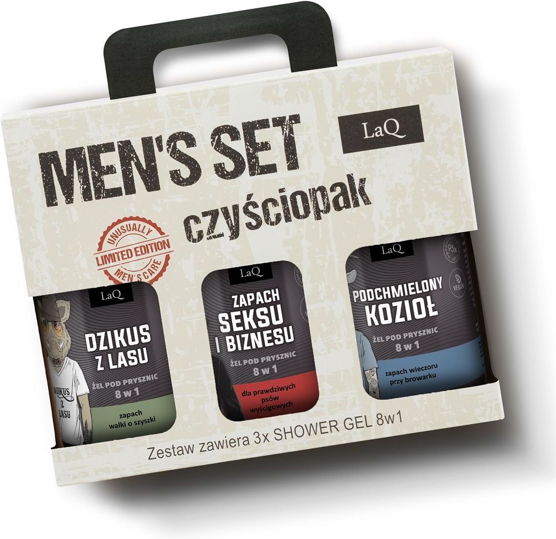 LaQ czarny Czyściopak MĘSKI - Zestaw żeli pod prysznic 3x500 ml Czarny Czyściopak MĘSKI to wyjątkowa kolekcja trzech naturalnych, wegańskich żeli pod prysznic, które oferują doskonałą pielęgnację skóry oraz intensywne, męskie zapachy. Stworzony z myślą o mężczyznach, którzy cenią produkty kosmetyczne wysokiej jakości, zestaw idealnie sprawdzi się jako prezent dla każdego faceta. Zestaw zapakowany jest w eleganckie pudełko z uchwytem, co sprawia, że jest to doskonały upominek na każdą okazję – urodziny, imieniny, Dzień Chłopaka, święta lub po prostu jako miły gest. Dla mężczyzny, który preferuje nietypowe kosmetyki, intensywne zapachy i naturalną pielęgnację. Zawartość zestawu Czyściopak MĘSKI od LaQ Żel pod prysznic DZIKUS Z LASU (500 ml) – dziki zapach inspirowany naturą, który łączy siłę lasu z intensywnymi męskimi akcentami. Żel pod prysznic DOBERMAN (500 ml) – dynamiczny, energizujący zapach z wyrazistymi nutami, stworzony dla mężczyzn, którzy lubią wyzwań i pewności siebie. Żel pod prysznic KOZIOŁ Z KLASĄ (500 ml) – elegancka kompozycja zapachowa, która łączy nuty roślinne z wyrafinowaną świeżością. Najważniejsze informacje o zestawie żeli pod prysznic od LaQ: Idealny na prezent – doskonały upominek na urodziny, imieniny, Dzień Chłopaka, święta czy inne okazje Trzy unikalne zapachy – żele w liniach: DOBERMAN, DZIKUS Z LASU, KOZIOŁ Z KLASĄ Naturalne i wegańskie – oparte na roślinnych składnikach, takich jak gliceryna, mocznik i wyciągi roślinne Eleganckie opakowanie – zapakowane w efektowne pudełko z uchwytem, idealne na prezent Pielęgnacja i zapach – nawilżają skórę, pozostawiając ją pachnącą przez cały dzień Wysoka jakość – produkty tworzone z dbałością o szczegóły Pojemność: 3x500 ml Producent: LaQ Zastosowanie Nanieś niewielką ilość żelu na wilgotną skórę lub gąbkę, delikatnie masuj do uzyskania piany, a następnie dokładnie spłucz wodą. Żel nadaje się do codziennego stosowania i pielęgnacji całego ciała. Składniki / Ingredients Żel pod prysznic DZIKUS Z LASU z ciemnej strony LaQ (500 ml): Aqua, Sodium Coco-Sulfate, Cocamidopropyl Betaine, Coco-Glucoside, Glycerin, Glyceryl Oleate, Quercus Petraea Bark Extract, Guar Hydroxypropyltrimonium Chloride, Sodium Benzoate, Potassium Sorbate, Sodium Chloride, Citric Acid, Parfum, Linalyl Acetate, Tetramethyl Acetyloctahydronaphthalenes. Żel pod prysznic DOBERMAN z ciemnej strony LaQ (500 ml): Aqua, Sodium Coco-Sulfate, Coco-Glucoside, Cocamidopropyl Betaine, Glycerin, Glyceryl Oleate, Piper Nigrum Fruit Extract, Elettaria Cardamomum Seed Extract, Sodium Lactate, Sodium PCA, Glycine, Fructose, Urea, Niacinamide, Inositol, Lactic Acid, Sodium Chloride, Sodium Benzoate, Potassium Sorbate, Citric Acid, Parfum. Żel pod prysznic KOZIOŁ Z KLASĄ z ciemnej strony LaQ (500 ml): Aqua, Glycerin, Cocamidopropyl Betaine, Sodium Lauroyl Methyl Isethionate, Sodium Methyl Oleoyl Taurate, Lauryl Glucoside, Coco-Glucoside, Humulus Lupulus Extract, Guar Hydroxypropyltrimonium Chloride, Citric Acid, Sodium Benzoate, Potassium Sorbate, Sodium Chloride, Parfum, Linalool.
