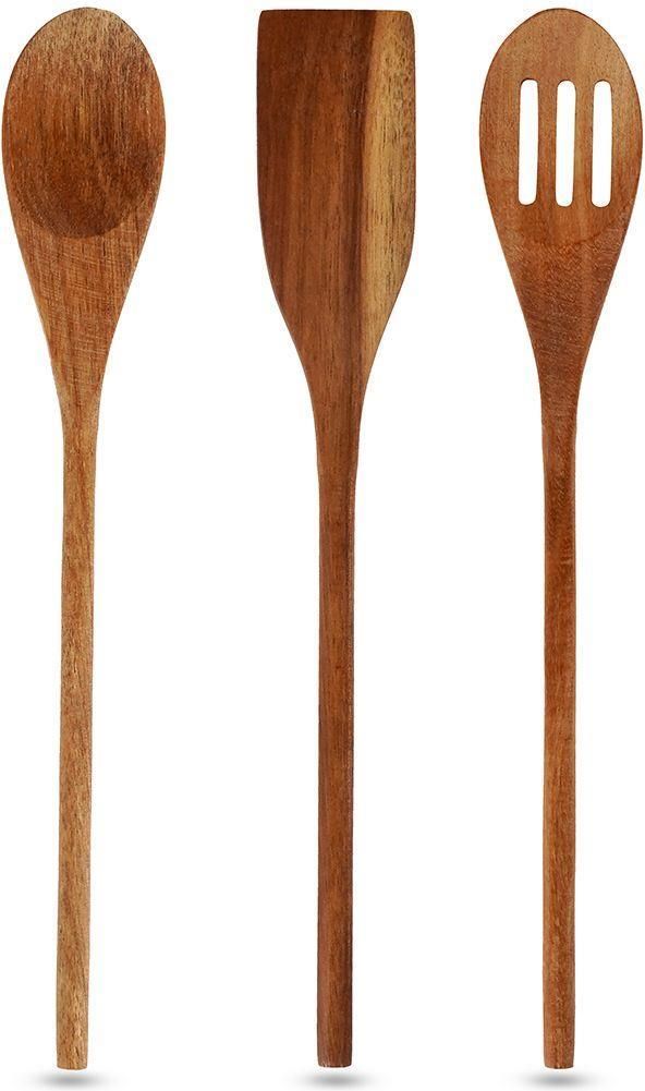 PRAKTYCZNE - Zestaw trzech przyborów kuchennych. W skład zestawu wchodzi: łyżka uniwersalna do mieszania, łyżka do odcedzania, łopatka uniwersalna. DREWNIANE - Wykonane z drewna akacjowego. Drewno akacjowe z którego zostały wykonane przybory jest materiałem ekologicznym i bezpiecznym dla zdrowia. Nie nadają się do mycia w zmywarce do naczyń. ODPORNE - Użyte drewno jest odporne na wilgoć i odkształcenia, nie chłonie zapachów, szybko schnie. BEZPIECZNE - Przybory kuchenne wykonane z tego materiału są bezpieczne dla naczyń teflonowych, granitowych, ceramicznych i z innymi powłokami nieprzywierającymi. WYGODNE - Przybory odpowiednio leżą w dłoni i zapewnią wygodne użytkowanie. Podstawowy zestaw przyborów kuchennych. W zestawie: 1x łyżka uniwersalna (30 x 5 cm), 1x łyżka do odcedzania (30 x 5 cm), 1x łopatka uniwersalna (30 x 4,5 cm). Solidnie wykonane z wytrzymałego i naturalnego drewna. Przydatne w każdej kuchni, dzięki nim wygodnie możemy przewracać oraz mieszać przygotowywane potrawy. Wyprodukowano zgodnie z europejskimi standardami.