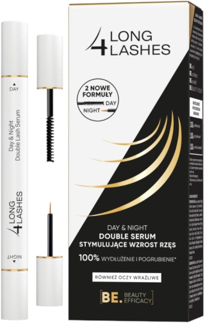 Long4Lashes Day & Night Double Serum 2w1 stymulujące wzrost rzęsSerum Long4Lashes to innowacyjne, dwufazowe rozwiązanie dla osób, które oczekują od pielęgnacji rzęs czegoś więcej. Dwie odrębne formuły – dzienna i nocna – zostały zamknięte w osobnych buteleczkach z aplikatorami, by działać komplementarnie i przynosić widoczne rezultaty.W ciągu dnia serum działa jak baza pod tusz, intensywnie odżywiając i regenerując rzęsy, nadając im objętość, elastyczność i połysk. Ułatwia stylizację, wzmacnia