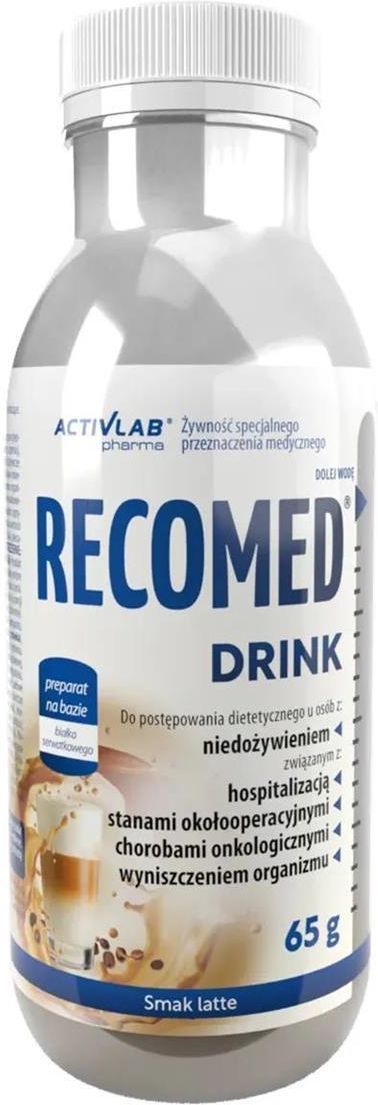 RECOMED DRINK smak latte butelka 65 g RECOMED® DRINK zawiera wszystkie niezbędne składniki odżywcze: białko, węglowodany, tłuszcz, błonnik pokarmowy oraz komplet witamin i składników mineralnych. Skoncentrowana forma produktu ułatwia podawanie i nie obciąża dodatkowo organizmu chorego. Białko obecne w produkcie to najwyższej jakości koncentrat białka serwatkowego (WPC) o wartości biologicznej BV 104. Skład aminokwasowy białka został ponadto zoptymalizowany przez dodanie aminokwasów w proporcjach niezbędnych do zwiększenia wartości odżywczej białka i uzyskania optymalnych proporcji aminokwasów egzogennych (EAA) zalecanych w dziennym spożyciu przez Światową Organizacje Zdrowia (WHO). Wskazania Do postępowania dietetycznego w niedożywieniu związanym z chorobą np. nowotworową oraz u osób: • przewlekle chorych • wymagających rekonwalescencji po operacjach chirurgicznych • w podeszłym wieku Dawkowanie RECOMED® DRINK może być stosowany jako jedyne źródło pożywienia (6 porcji dziennie) lub jako uzupełnienie diety lub jej częściowe zastępowanie (1-3 porcji dziennie). Wartości odżywcze % energii z: 1 porcja (65 g) Białka 24% kcal Węglowodanów 51% kcal Tłuszczu 21% kcal Błonnika 4% kcal Osmolarność roztworu: 500 mOsm/l Wartość odżywcza w 100 g w 1 porcji (65 g) Wartość energetyczna 1632 kJ / 388 kcal 1061 kJ / 252 kcal Tłuszcz, w tym: 9,2 kg 6,0 g kwasy tłuszczowe nasycone 0,6 g 0,4 g kwasy tłuszczowe jednonienasycone 5,8 g 3,8 g kwasy tłuszczowe wielonienasycone 0,6 g 0,4 g Węglowodany, w tym: 49,2 g 32,0 g cukry 2,5 g 1,6 g Błonnik 7,7 g 5,0 g Białko 23,1 g 15,0 g Sól 1,15 g 0,75 g Aminokwasy egzogenne w 100 g w 1 porcji (65 g) 1632 kJ / 388 kcal 1061 kJ / 252 kcal L-izoleucyna 1538 mg 1000 mg L-leucyna 3000 mg 1950 mg L-lizyna 2308 mg 1500 mg L-metionina + L-cysteina 1154 mg 750 mg L-fenyloalanina + L-tyrozyna 1923 mg 1250 mg L-treonina 1154 mg 750 mg L-tryptofan 308 mg 200 mg L-walina 2000 mg 1300 mg Składniki mineralne w 100 g w 1 porcji (65 g) Sód 462 mg 300 mg Potas 923 mg 600 mg Chlorki 369 mg 240 mg Wapń 369 mg 240 mg Fosfor 323 mg 210 mg Magnez 173 mg 112 mg Żelazo 6,5 mg 4,2 mg Cynk 4,6 mg 3 mg Miedź 0,5 mg 0,3 mg Mangan 0,9 mg 0,6 mg Selen 25 mcg 16,5 mcg Chrom 18 mcg 12 mcg Molibden 23 mcg 15 mcg Jod 69 mcg 45 mcg Witamina A 369 mcg 240 mcg Witamina D 2,3 mcg 1,5 mcg Witamina E 5,5 mg 3,6 mg Witamina K 35 mcg 22,5 mcg Witamina C 37 mg 24 mg Tiamina 0,5 mg 0,33 mg Ryboflawina 0,6 mg 0,42 mg Niacyna 7,4 mg 4,8 mg Witamina B6 0,6 mg 0,42 mg Biotyna 23 mcg 15 mcg Kwas pantotenowy 2,8 mg 1,8 mg Składniki Smak latte: maltodekstryna, koncentrat białka serwatkowego (z mleka), aminokwasy (L-izoleucyna, L-leucyna, L-lizyna, L-metionina, L-cysteina, L-fenyloalanina, L-tyrozyna, L-treonina, L-walina), olej słonecznikowy, inulina, składniki mineralne (chlorek sodu, cytrynian sodu, chlorek potasu, cytrynian potasu, sole wapniowe kwasu ortofosforowego, sole sodowe kwasu ortofosforowego, sole magnezowe kwasu cytrynowego, siarczan żelaza(II), siarczan cynku, siarczan miedzi(II), siarczan manganu, selenian(IV) sodu, chlorek chromu(III), molibdenian(VI) sodu, jodek potasu), witaminy (octan retinylu, cholekalcyferol, octan DL-alfa-tokoferylu, filochinon, kwas L-askorbinowy, monoazotan tiaminy, ryboflawina, nikotynamid, chlorowodorek pirydoksyny, kwas foliowy, cyjanokobalamina, D-biotyna, D-pantotenian wapnia), aromaty, substancje słodzące: acesulfam K i sukraloza; barwnik - karmel amoniakalny. Produkt może zawierać pochodne: zbóż zawierających gluten, soi, mleka. Żywność specjalnego przeznaczenia medycznego. Zawiera substancje słodzące. Proszek do sporządzania roztworu doustnego. Ostrzeżenie: Produkt nie jest przeznaczony do stosowania pozajelitowego. Ważna informacja: Produkt musi być stosowany pod nadzorem lekarza. Produkt jest odpowiedni do stosowania jako jedyne źródło pożywienia. Produkt jest przeznaczony dla osób dorosłych i dzieci powyżej 3 roku życia.