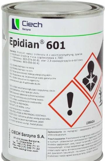 Opis Epidian 601 -1kg Epidian 601 jest modyfikowaną żywicą epoksydową o dość niskiej lepkości, w formie klarownej cieczy o barwie jasnożółtej. Doskonale nadaje się jako syciwo do laminowania ręcznego z użyciem zbrojenia szklanego, karbonowego, itp. oraz do sporządzania szpachlówek i innych kompozycji z wypełniaczami, a także do impregnacji drewna. Może być używany także doklejenia wielu materiałów takich jak drewno, tworzywa sztuczne (za wyjątkiem PP i PE), metale, ceramika, itp. Nie rozpuszcza styropianu. Wraz z utwardzaczem Z1 lub IDA doskonale nadaje się dokonywania napraw laminatu poliestrowo szklanego. Utwardzona kompozycja jest odporna na oleje, smary, rozcieńczone ługi, kwasy i krótkotrwałe działanie temperatury do 80 st. Celcjusza. Właściwości fizykochemiczne: Postać: niskolepka ciecz Barwa: jasnożółta do żółtej Temperatura wrzenia: ok. 210°C (początek) Temperatura zapłonu: 180°C Liczba epoksydowa: 0,50-0,55 mol/100g Gęstość w 25°C: ok. 1,14 g/cm3 Lepkość w 25°C: 700 – 1100 mPa