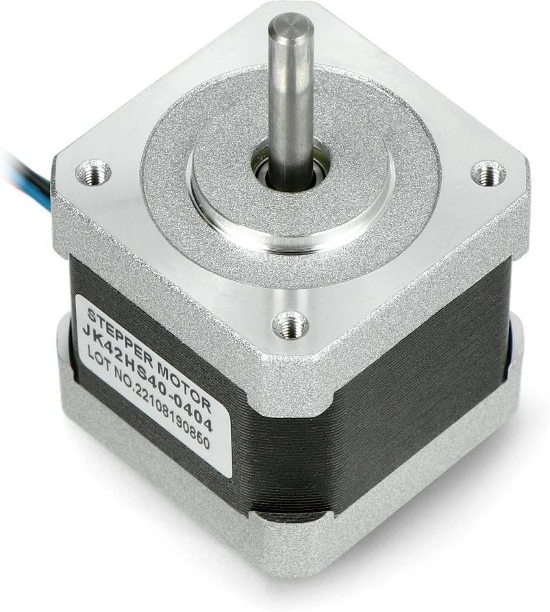 Silnik krokowy JK42HS40-0404 200 kroków/obr 12V/0,4A/0,4Nm Silnik krokowy bipolarny, cztero przewodowy. Posiada rozdzielczość 200 kroków na obrót (1,8 stopnia). Zasilany jest napięciem 12,0 V, pobiera prąd 400 mA na cewkę. Moment wynosi 4,0 kg*cm (0,4 Nm). Wymiary to 42 x 42 x 40 mm (NEMA 17). …