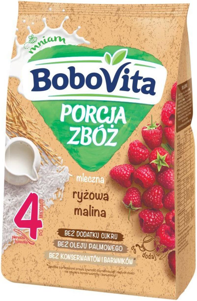 Bobovita Kasza Mleczna Ryżowa Malina Po 4 Miesiącu 210 G Opis produktu BoboVita Porcja Zbóż powstaje z najwyższej jakości różnorodnych zbóż pochodzących z upraw specjalnie dedykowanych najmłodszym dzieciom. Nie zawiera dodatku cukru, a tylko naturalnie występujące cukry. Kaszka Porcja Zbóż mleczno-ryżowa malina została starannie skomponowana tak, by zawierała to, co dobre dla Twojego dziecka. zboża ryż + mleko + owoce - pyszny smak malin - ważne składniki zbilansowanego jadłospisu Źródło kluczowych witamin i składników mineralnych: Zawiera 7 witamin (A*, D*, E, C, tiamina*, B6, biotyna) + składniki mineralne (wapń*, jod, żelazo) Żelazo i wit. C dla prawidłowego funkcjonowania układu odpornościowego Jod dla wsparcia rozwoju poznawczego Biotyna dla prawidłowego metabolizmu energetycznego To lekkostrawny i pełnowartościowy posiłek, przygotowany na bazie wysokiej jakości zbóż, mleka modyfikowanego i pysznych owoców,  wzbogacony w witaminy i składniki mineralne, m.in. wapń i żelazo. Jestem tym co mi dajesz, Mamo! Jako producent żywności dostarczamy produkty dla niemowląt i małych dzieci dostosowane do ich potrzeb na każdym etapie rozwoju.