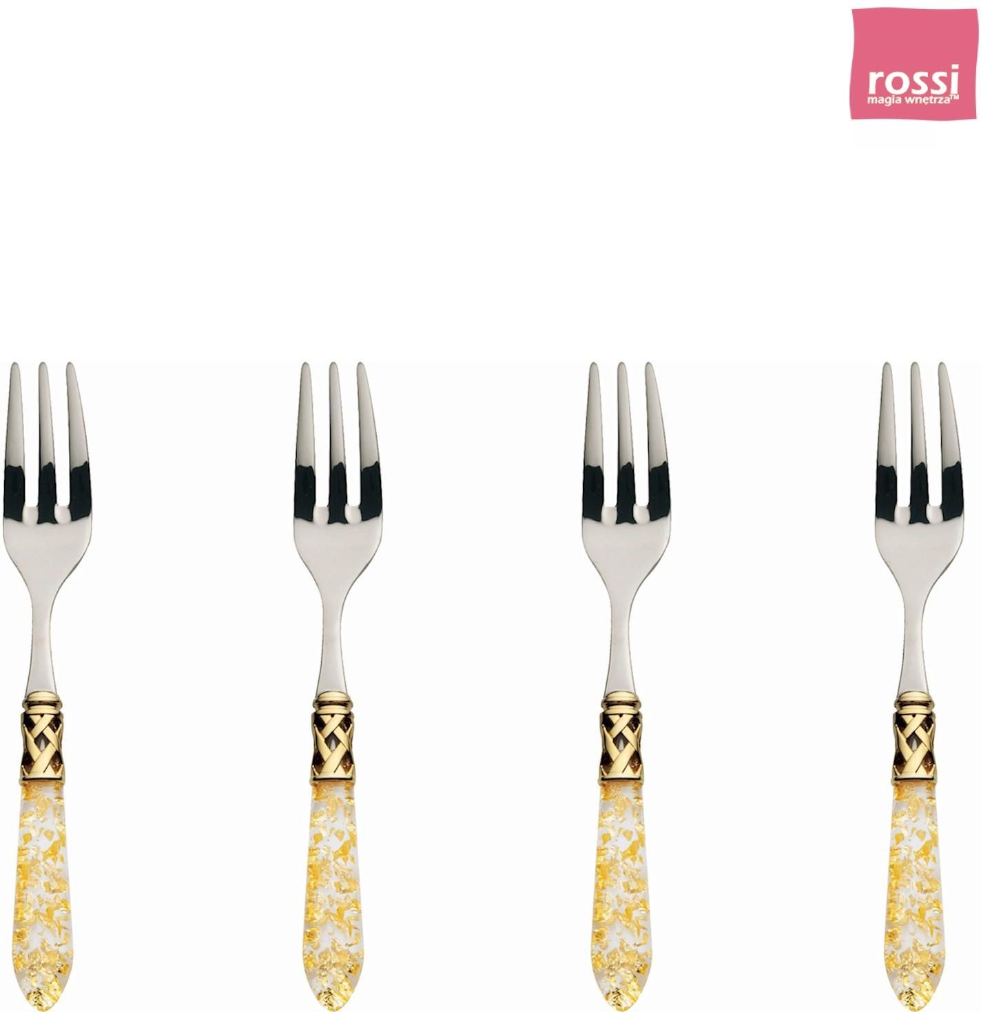 Casa Bugatti ALADDIN GOLD Zestaw 6 widelczyków Casa Bugatti ALADDIN GOLD Zestaw 6 widelczyków Ten niezwykle oryginalny, nowoczesny i funkcjonalny zestaw widelczyków zachwyca nie tylko wyglądem, ale też niezwykłą jakością. Sztućce wykonane są ze stali szlachetnej 18/10 polerowanej i masy akrylowej transparentnej z cząsteczkami złota. Dodatkowo zostały wykończone ozdobnym pozłacanym pierścieniem. Właściwości: Materiał: stal nierdzewna 18/10, akryl, pozłacany pierścień Długość: 17 cm Wykończenie: złota rączka Można myć w zmywarce do 50/55°C, zalecane mycie ręczne