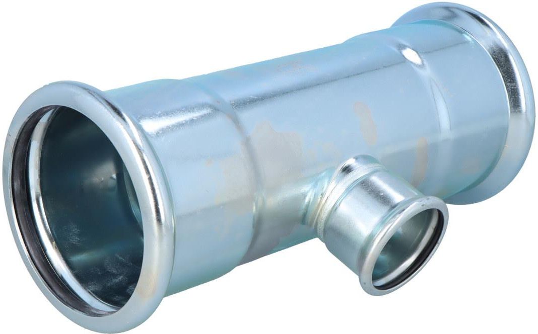 Trójnik redukcyjny 90° Steel w zakresie średnic 12/15/12 - 108/88.9/108 stalowy ocynkowany (Fe/Zn88), grubość warstwy 8-15 µm do połączeń zaprasowywanych z funkcją kontrolowanego przecieku LBP. Posiada uszczelnienie typu O-ring