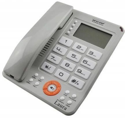 Telefon przewodowy Mescomp Laura MT-816 Laura Szary Produkt nowy. Duży, czytelny podświetlany wyświetlacz Duże i funkcjonalne klawisze 3 numery pamięci bezpośredniej Wyświetlanie numeru abonenta dzwoniącego, daty i godziny i połączenia Możliwość przeglądania i oddzwaniania, oraz usuwanie otrzymanych połączeń Pamięć do 30 numerów przychodzących Pamięć do 5 numerów wychodzących Budzik Funkcja VIP - indywidualny dzwonek Optyczna sygnalizacja przychodzącego połączenia Tryb głośnomówiący: wybieranie numeru i możliwość rozmowy bez podnoszenia słuchawki (Speaker Phone) Regulacja głośności dzwonka - 4 poziomy Regulacja kontrastu wyświetlacza - 5 poziomów Dzwonek - 8 monofonicznych melodii dzwonka Data/godzina Kalkulator Informacje o czasie trwania połączenia w trakcie rozmowy Pulse/Tone Powtarzanie ostatnio wybranego numeru - Redial ZAWARTOŚĆ ZESTAWU: Telefon MESCOMP LAURA SZARY Oryginalne pudełko (otwierane, posiada ślady magazynowania) Słuchawka Kabel Telefoniczny
