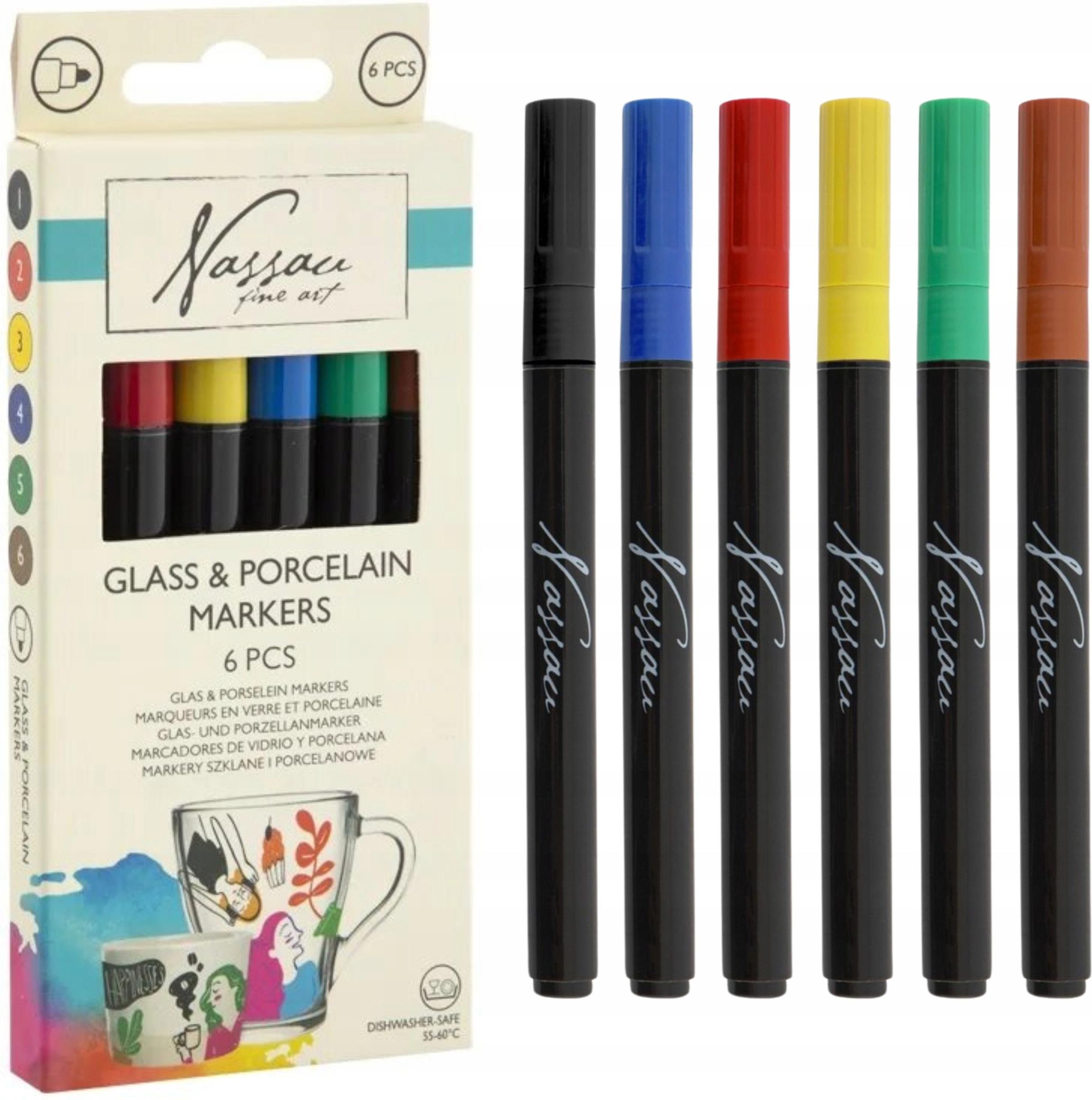 MARKERY DO SZKŁA PORCELANY CERAMIKI MAZAKI PISAKI FLAMASTRY ZESTAW 6 sztuk Rozświetl swoje codzienne życie kreatywnością dzięki naszym wyjątkowym markerom do szkła porcelany. To zestaw 6 kolorowych markerów, które pozwolą Ci wyrazić swoją wyobraźnię na szkle, porcelanie czy ceramice w sposób łatwy i przyjemny. Cechy Zestaw 6 sztuk Do szkła, ceramiki, porcelany Nadają się również do kaligrafii Do malowania naczyń, ozdób świątecznych, bombek, jajek itp. Kolory czarny czerwony niebieski czarny zielony brązowy Sposób użycia Markery są łatwe do obsługi, dzięki precyzyjnym końcówkom, które umożliwiają precyzyjne rysowanie i malowanie. Po użyciu markera pozostaw pokrytą nim powierzchnię do wyschnięcia na 4 godziny. Utwardź w piekarniku nagrzanym do temperatury 60°C przez 90 minut. Wstaw do zimnego piekarnika i włącz zegar, kiedy zostanie uzyskana wymagana temperatura. Pozostaw w piekarniku z otwartymi drzwiczkami. Nie stosuj na szkło kryształowe lub powierzchnie mające kontakt z żywnością lub napojami. Można myć w zmywarce w temperaturze 55-60°C.