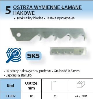 Ostrza wymienne amane hakowe 18mm 10szt. 31307 10 szt. ostrzy hakowych w pudeku Japoska stal SK5 Grubo 0.5 mm Ostrze 18 mm Rodzaj: Ostrza hakowe