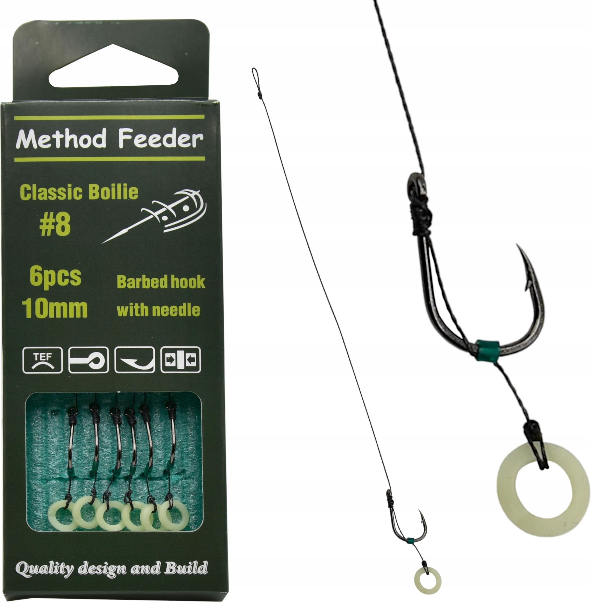 Haczyki Method Feeder na przyponie z gumką rozmiar #8 Haczyki do methody na przeponie z gumką do kulek, pelletu i innych dużych przynęt. Specyfikacje Materiał: teflon Typ ostrza: z zadziorem Zakończenie: z oczkiem Rozmiar haka: #8 Ilość w opakowaniu: 6 sztuk Długość przyponu: 15 cm Przypon: …