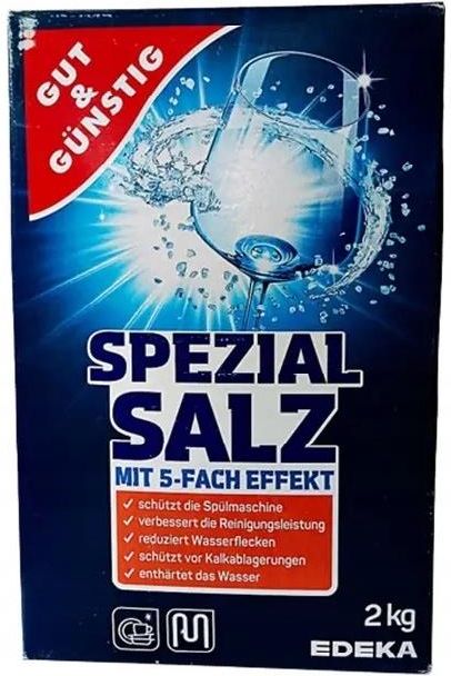 Gut & Gunstig, Sól do zmywarki, 2 kg Gut & Gunstig, Sól do zmywarki, 2 kg GUT & GUNSTIG SPEZIAL SALZ - GRUBOZIARNISTA SÓL DO ZMYWAREK 2 KG Dzięki specjalnej formule sól skutecznie zmiękcza wodę, jednocześnie poprawiając wydajność detergentów myjących i zapobiegając powstawaniu zacieków i smug. Sól Gut and Gunstig jest gruboziarnista i wolna od zarazków oraz zanieczyszczeń. Regularne stosowanie soli zapewnia prawidłowe funkcjonowanie zmywarki. Sprawdzi się w każdej zmywarce. Pojemność: 2kg