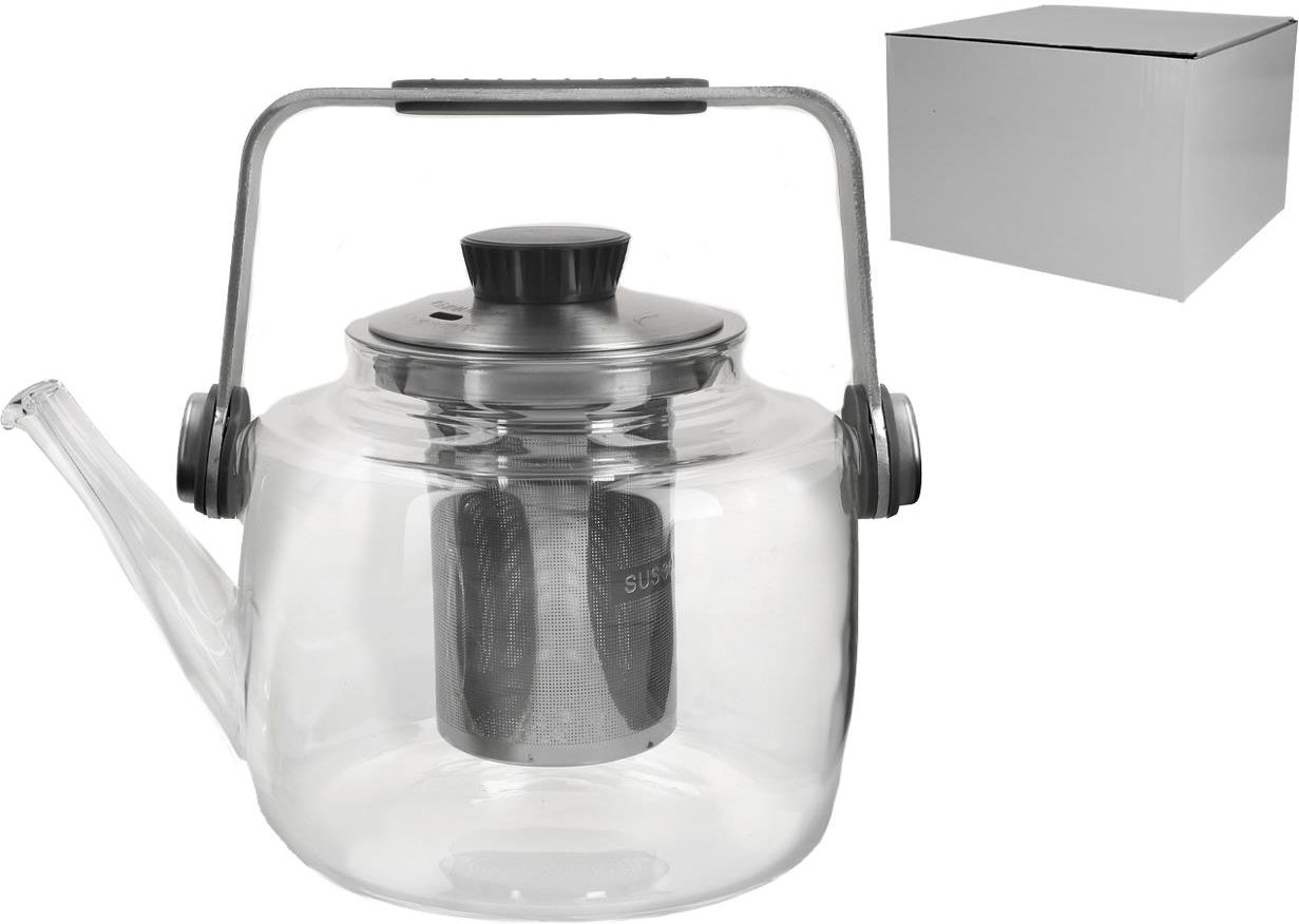 Szklany czajniczek z zaparzaczem. Doskonały na przyrządzenie herbatki na chłodne wieczory. Kolekcja: czajniki szklane Rozmiar: 1300ml Opakowanie: szary karton Liczba sztuk w opakowaniu: 24 Podgrupa: czajniki Tematyka: zielarstwo, zdrowie EAN: 5905450821692