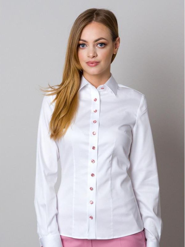 Biała, taliowana koszula damska o gładkiej fakturze z klasycznym kołnierzykiem i różowymi perłowymi guzikami