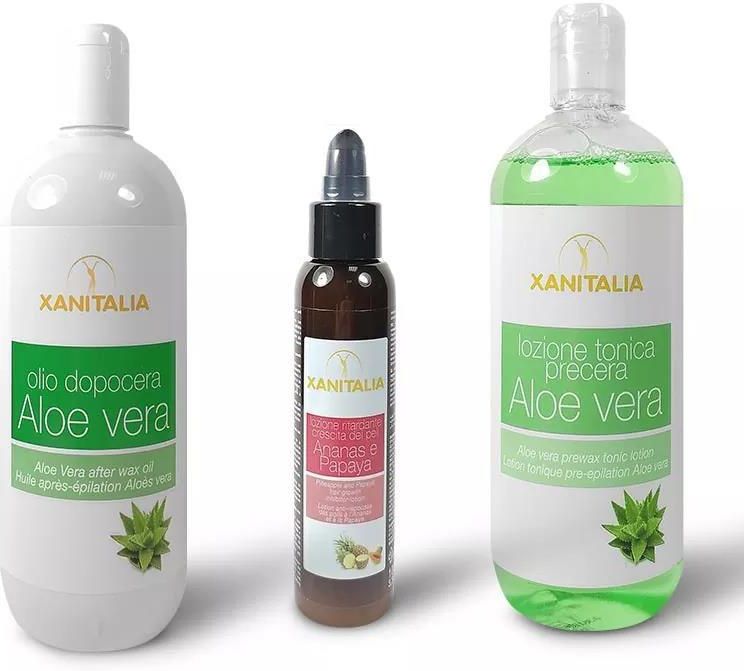 Oliwka po depilacji Aloe Vera 500 ml Rewelacyjnie skuteczna oliwka do stosowania po depilacji. Wyróżnia się niezwykle aksamitną konsystencją. Bogaty w oleje roślinne, oczyszcza skórę do głębi, jednocześnie ją odżywiając, zapewniając prawidłowy poziom nawilżenia. Dzięki zawartości Aloe Vera łagodzi podrażnienia spowodowane zabiegiem depilacji oraz nadaje się do bardzo delikatnej, skłonnej do podrażnień skóry. Sposób użycia: po zakończonym zabiegu depilacji skórę oczyścić wacikiem nasączonym oliwką. Oliwka zmywa resztki wosku ze skóry. Nadmiar oliwki usunąć. Płyn oczyszczający przed depilacją 500 ml Balsam Aloe Vera przed zabiegiem depilacji Balsam o płynnej, nieklejącej się konsystencji, która szybko się wchłania. Dzięki takiemu zastosowaniu będziemy mieli lepszą przyczepność włosów a tym samym szybszy i efektywniejszy zabieg. Dodatkowo wygładza i ochrania skórę dzięki Aloe Vera. Sposób użycia: Przed depilacja wmasuj niewielką ilość produktu w skórę. Emulsja opóźniająca wzrost włosów 100 ml Emulsja po depilacji hamująca wzrost włosów z ekstraktem z ananasa i papai. Preparat stosowany systematycznie po depilacji spowalnia odrost włosów. Dodatkowo zawiera papainę która hamuje wzrost włosów. Produkt niezbędny w zabiegach depilacji.