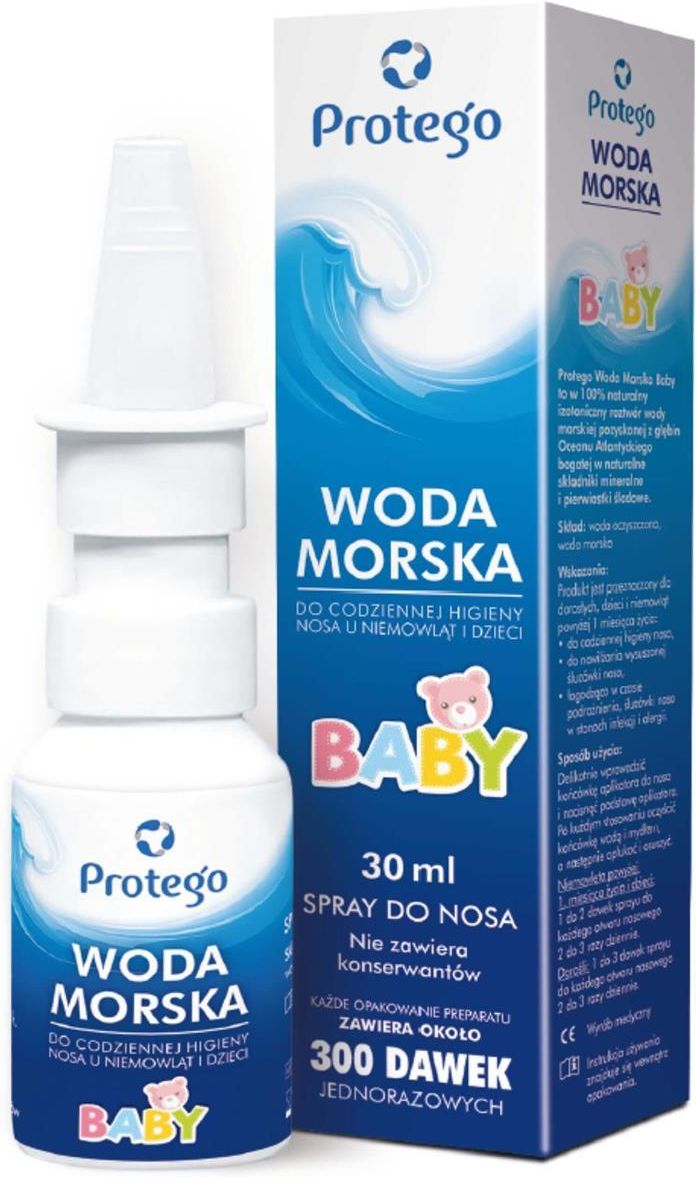wyrób medyczny SPRAY DO NOSA do codziennej higieny nosa u niemowląt i dzieci Protego Woda Morska Baby to w 100% naturalny izotoniczny roztwór wody morskiej pozyskanej z głębin Oceanu Atlantyckiego bogatej w naturalne składniki mineralne i pierwiastki śladowe. Produkt jest przeznaczony dla dorosłych, dzieci i niemowląt powyżej 1 miesiąca życia:  - do codziennej higieny nosa, - do nawilżania wysuszonej śluzówki nosa, - działa łagodząco w czasie podrażnienia, śluzówki nosa w stanach infekcji i alergii. Opakowanie 30 ml  - zawiera około 200 dawek jednorazowych NIE ZAWIERA KONSERWANTÓW Skład: woda oczyszczona, woda morska w 100% naturalny izotoniczny roztwór wody morskiej pozyskanej z głębin Oceanu Atlantyckiego bogatej w naturalne składniki mineralne i pierwiastki śladowe. Pojemność 30 ml – Butelka zawiera około 200 dawek jednorazowych SPRAY DO NOSA do codziennej higieny nosa u niemowląt i dzieci Produkt jest przeznaczony dla dorosłych, dzieci i niemowląt powyżej 1 miesiąca życia:  - do codziennej higieny nosa, - do nawilżania wysuszonej śluzówki nosa, - działa łagodząco w czasie podrażnienia, śluzówki nosa w stanach infekcji i alergii. Protego Woda Morska Baby jest izotonicznym roztworem wody morskiej, nawilża suchą śluzówkę nosa, stosuje się ją pomocniczo w czasie nieżytu nosa, zapalenia zatok oraz kataru siennego, łagodząco w czasie podrażnienia śluzówki nosa w stanach infekcji i alergii oraz do codziennej higieny i oczyszczenia nosa. Sposób użycia: Delikatnie wprowadzić końcówkę aplikatora do nosa i nacisnąć podstawę aplikatora. Po każdym stosowaniu oczyścić końcówkę wodą i mydłem, a następnie opłukać i osuszyć. Niemowlęta powyżej 1. miesiąca życia i dzieci: 1 do 2 dawek sprayu do każdego otworu nosowego 2 do 3 razy dziennie. Dorośli: 1 do 3 dawek sprayu do każdego otworu nosowego 2 do 3 razy dziennie. Środki ostrożności: Nie stosować preparatu w przypadku stwierdzenia nadwrażliwości na którykolwiek ze składników produktu.  Nie stosować po upływie terminu przydatności do użycia. Przechowywać w oryginalnym opakowaniu w temperaturze poniżej 25°C. Chronić przed bezpośrednim działaniem promieni słonecznych. PRZECHOWYWAĆ W MIEJSCU NIEDOSTEPNYM I NIEWIDOCZNYM DLA DZIECI. Wytwórca: GLOBAL PHARMA CM SP. Z O.O. ul. Berezów 49A, 26-130 Suchedniów Dystrybutor: Salvum Lab Sp. z o.o. Sp. k. ul. Jana Sobieskiego 53; 58-500 Jelenia Góra