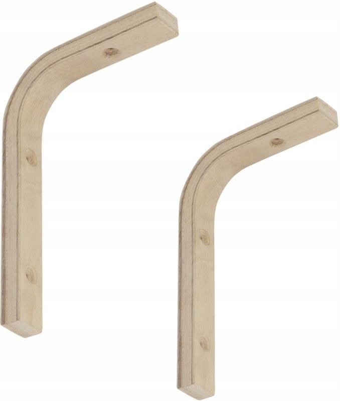 Wspornik do półek - podpora drewniana - WDGL Proste wsporniki ze sklejki giętej, wąskie i delikatne. Pasują do jasnych sypialni, pokoi, a nawet kuchni. Wykonane są z surowego drewna, dlatego warto zabezpieczyć je bezbarwnym lakierem lub pomalować na dowolny kolor farbą. Szerokość wspornika: 20mm Grubość wspornika: 10mm Mocowanie do ściany: Wkręt: Ø4,5x55 Ilość: 6 Kołek: Ø8x40 Ilość: 6 OBCIĄŻENIE - Różne rodzaje ścian wymagają użycia różnych typów mocowań. Należy zawsze używać śrub, wkrętów lub kołków przeznaczonych do odpowiedniego rodzaju ściany. Dopuszczalne obciążenie elementu zależy zawsze od rodzaju ściany, użytego mocowania i sposobu obciążenia. Komplet składa się z dwóch wsporników i zestawu wkrętów i kołków do mocowania do ściany.