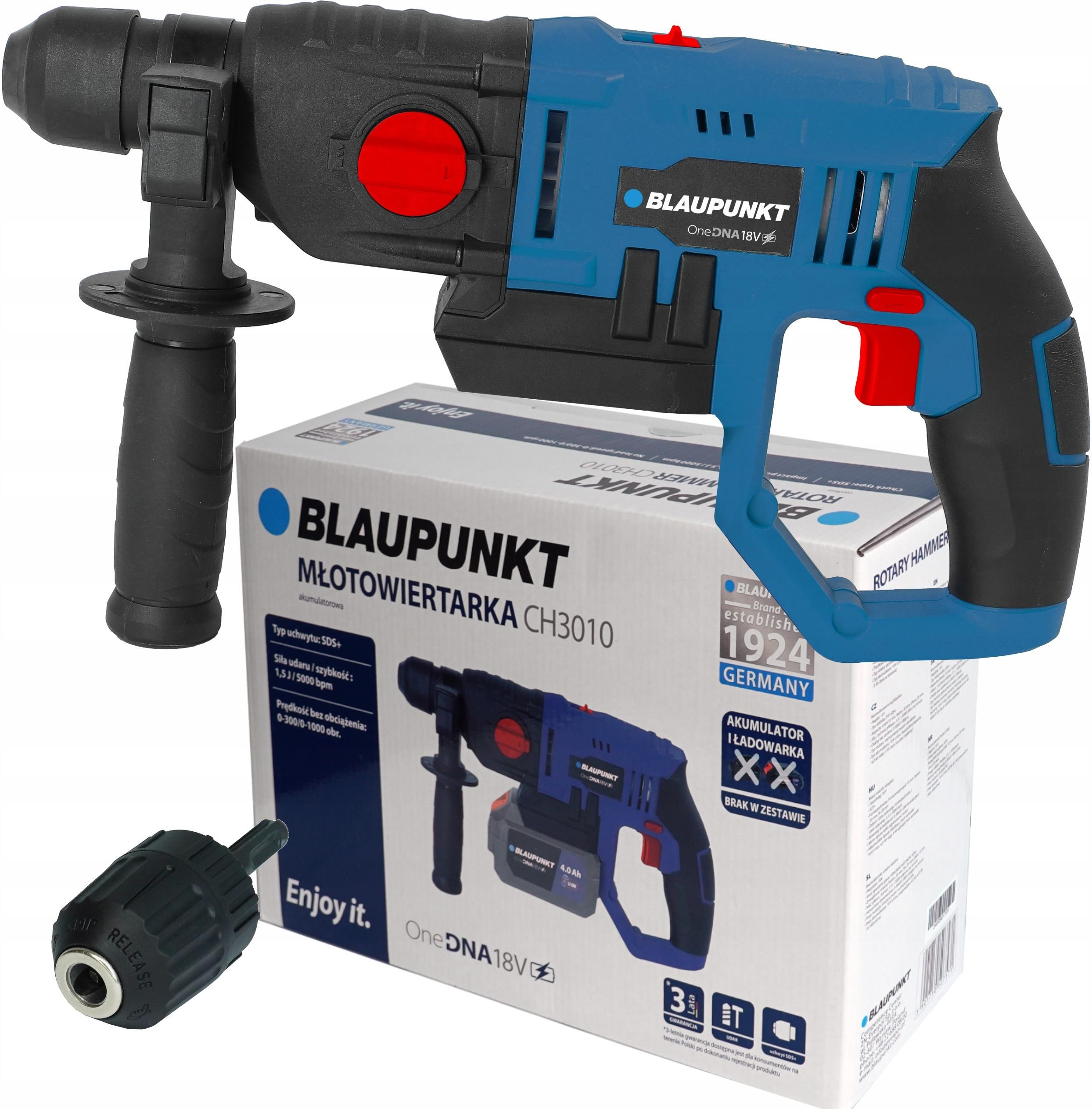 BLAUPUNKT MŁOTOWIERTARKA ONEDNA 18V CH 3010 Produkt Nowy Oryginalnie Zapakowany Pochodzi z Polskiej dystrybucji 〰〰〰〰〰〰〰〰〰〰〰〰〰〰〰〰〰〰 CECHY PRODUKTU Dodatkowa funkcjonalność Dodatkowy uchwyt samozaciskowy Rodzaj silnika szczotkowy DC Waga netto (kg) 1,3 Wymiary cm (S x W x G) 34 x 21 x 18 Zestaw zawiera Instrukcję obsługi Kartę gwarancyjną Młot udarowy CH3010 Ogranicznik głębokości wiercenia Uchwyt pomocniczy Uchwyt samozaciskowy Napięcie 18 V Akumulator 18 V Li-Ion, zalecane 4,0 Ah lub 5 Ah (brak w zestawie) Prędkość bez obciążenia II bieg 0-1000 obr./min.I bieg 0-300 obr./min. Regulacja prędkości w spuście Uchwyt SDS+ Średnica wiercenia beton: 20 mm drewno: 20 mm stal: 10 mm Siła udaru 1,5 J Szybkość udaru 5000 BPM 〰〰〰〰〰〰〰〰〰〰〰〰〰〰〰〰〰〰 Młot udarowy CH3010 marki BLAUPUNKT Młot udarowy CH3010 to zaawansowane narzędzie stworzone z myślą o najbardziej wymagających użytkownikach, idealne do różnorodnych prac remontowych i budowlanych. Zaprojektowany przez markę Blaupunkt model ten łączy w sobie niezawodność, efektywność oraz nowoczesne technologie. Wydajność Model CH3010 działa na platformie akumulatorowej BLAUPUNKT OneDNA 18V, co jest gwarancją wysokiej wydajności oraz pełnej mobilności bez ograniczeń wynikających z używania przewodów. Dzięki temu użytkownik może swobodnie pracować w różnych miejscach, nawet tam gdzie dostęp do zasilania sieciowego jest ograniczony. Typ uchwytu SDS Młot udarowy wyposażony jest w uchwyt SDS+, który daje możliwość szybkiej i łatwej zmianie osprzętu. System ten jest standardem w profesjonalnych narzędziach, gdzie zastosowanie ma pewne mocowanie wierteł i dłut, co jest kluczowe dla bezpieczeństwa i wygody pracy. 2 tryby pracy Urządzenie CH3010 oferuje dwa tryby pracy: wiercenie oraz wiercenie z udarem. Dzięki temu narzędzie jest wszechstronne i doskonale sprawdza się w różnych materiałach. Maksymalna średnica wiercenia wynosi 10 mm dla stali, 20 mm dla betonu oraz 20 mm dla drewna, co czyni CH3010 wszechstronnym narzędziem do prac w różnych środowiskach. Moc i siła udarowa Młot udarowy generuje siłę udaru na poziomie 1,5 J przy maksymalnej szybkości 5000 uderzeń na minutę. Użytkownik może skutecznie wykonywać otwory w najtwardszych materiałach, takich jak beton czy stal. Dwubiegowa przekładnia oraz regulacja prędkości w spuście pozwalają na precyzyjne dostosowanie urządzenia do aktualnych potrzeb i specyfiki zadania. Zasilanie Urządzenie jest zasilane akumulatorem 18 V Li-Ion, a dla optymalnej wydajności zalecane są akumulatory o pojemności 4,0 Ah lub 5,0 Ah (nie są dołączone do zestawu).