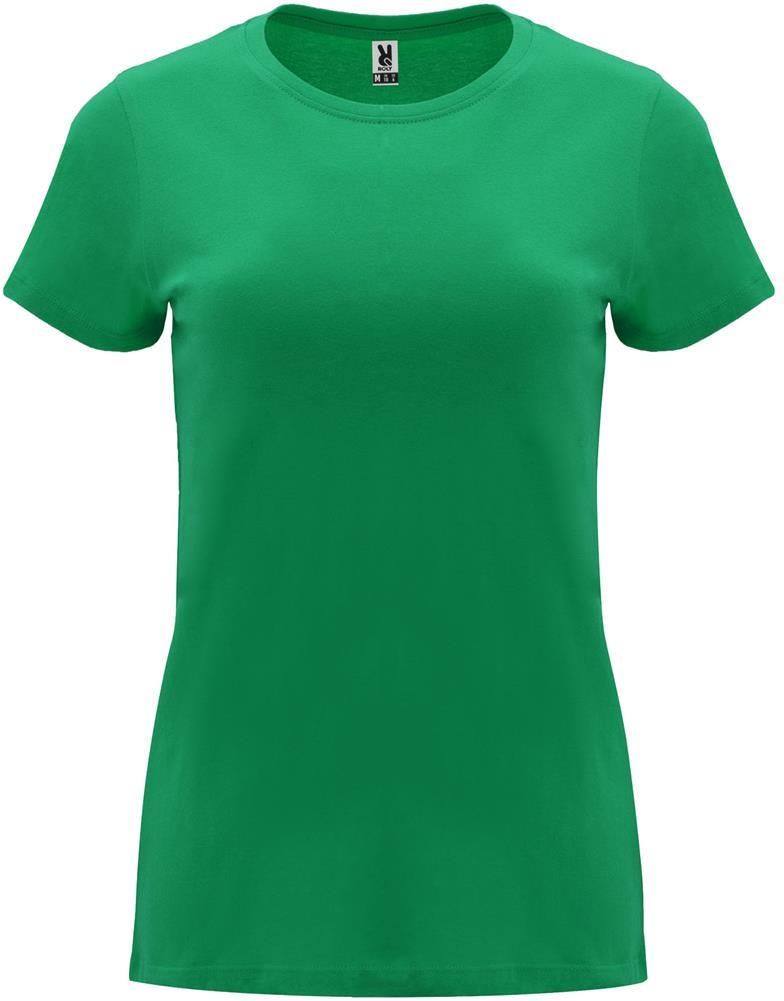 Damska dopasowana koszulka z krótkim rękawem. Okrągły prążkowany dekolt 1x1. Wzmocnione, kryte szwy na kołnierzu. Usuwalna metka.
