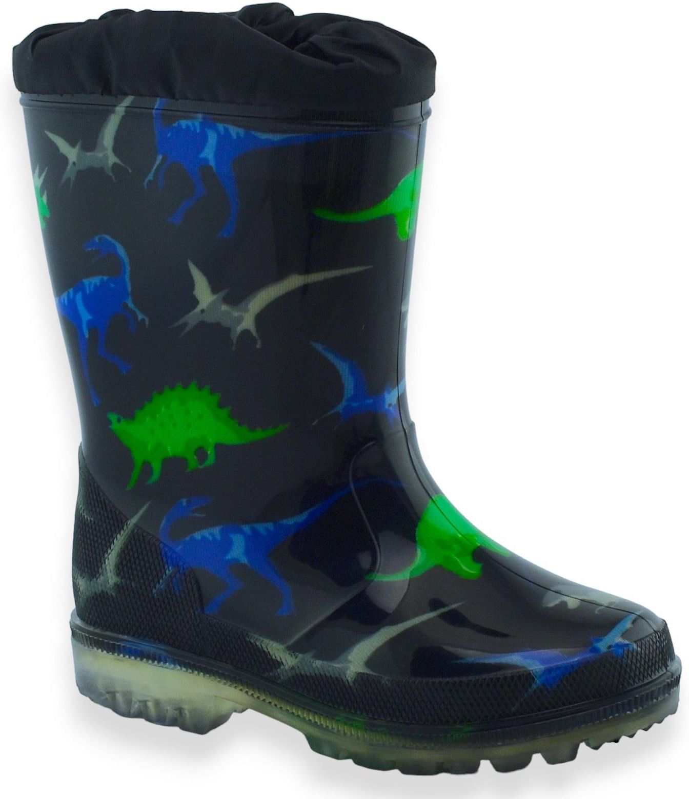 Chłopięce kalosze w czarnym kolorze z dinozaurami. Kalosze zakończona ściągaczem, który uchroni przed dostaniem się wody, błota do środka. Idealne na wiosnę i lato, na deszcz i spacery po lesie. Stopy Twojego dziecka będą suche.