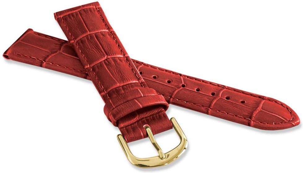 Czerwony półmatowy przeszywany zwężany o 2 mm skórzany pasek do zegarka Lavvu. Faktura skóry krokodyla. Szerokość 20 mm. Pasuje do każdego zegarka i smartwatcha ze standardowym mocowaniem o szerokości 20 mm. Teleskopy w zestawie