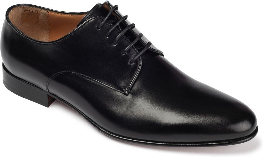 Czarne eleganckie buty derby wykonane ze skóry licowej. Buty posiadają odkrytą przyszwę. Jest to taka sama konstrukcja jak butów lakierek. Buty są szyte w Portugalii. Ten rodzaj eleganckich butów jest mniej formalny niż buty lotniki czy też oxfordy. Dlatego poleca się je przede wszystkim do …