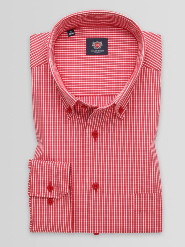 Czerwona klasyczna koszula w drobną kratkę z podpinanym kołnierzykiem, 100% bawełny