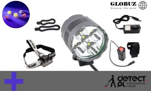 Amber Moon 42W latarka czołowa UV do poszukiwania bursztynu Latarka czołowa UV Amber Moon to narzędzie idealne do poszukiwania bursztynu na plaży i do poszukiwań w wodzie. W zestawie akumulator 6000 mAh Długośc fali 395 nm Latarka przeznaczona jest dla średnio zaawansowanych poszukiwaczy lub tych którzy lubią mieć wolne ręce. Reflektor oparty jest na tej samej, dobrze znanej technologii z Amber Moon Pro. Lampa ma moc 42W (6x7W) co czyni ją idealną do rozświetlania bursztynu. Diody LED nadają bursztynowi żółtawy blask i ułatwiają zauważenie go na plaży. Czołówka ma 3 ustawienia światła: mocne, średnie i słabe światło, może świecić do 3 godzin przy silnym świetle. Do lampy dołączony jest bardzo długi przewód do akumulatora, co umożliwia używanie lampy jako czołówki lub latarki ręcznej. Specyfikacja Moc: 42 wat Funkcje: max-med-min Czas pracy: 2-3h Zasięg max: 20m Waga: 150 g Długość fali: 395nm LED: 6 x CREE XM-L T6 LED 7W W zestawie znajdziesz 1x Latarka czołowa UV Amber Eye 42W 1x Akumulatory 6000 mAh 1x Ładowarka 1x Opaska na głowę oraz gumki do montażu.