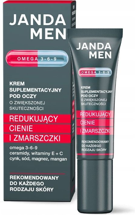 JANDA MEN Krem pod oczy OMEGA 3‑6‑9 redukcja zmarszczek, cienie, nawilżenie 15 ml JANDA MEN Krem suplementacyjny pod oczy OMEGA 3‑6‑9 15 ml Zaawansowany krem stworzony specjalnie dla męskiej skóry wokół oczu. Formuła oparta na kompleksie kwasów Omega 3‑6‑9 oraz składnikach wspierających regenerację i rozświetlenie działa tam, gdzie skóra jest najcieńsza. Produkt wygładza zmarszczki i kurze łapki, zmniejsza widoczność cieni pod oczami, intensywnie nawilża i poprawia jędrność. Krem szybko się wchłania, nie pozostawia tłustej warstwy i zapewnia komfort przez cały dzień. Korzyści Widoczne wygładzenie skóry już po 1 tygodniu regularnego stosowania. Redukcja cieni i oznak zmęczenia po około 2 tygodniach. Intensywne, długotrwałe nawilżenie i odżywienie delikatnej skóry wokół oczu. Poprawa elastyczności i napięcia skóry; szybkie wchłanianie, brak efektu tłustości. Dla kogo: Produkt rekomendowany dla mężczyzn wszystkich typów skóry, szczególnie dla osób chcących zredukować zmarszczki, cienie i oznaki zmęczenia w okolicach oczu. Sposób użycia: Nanieś niewielką ilość kremu i delikatnie wklep opuszkami palców w okolice oczu; stosuj rano i wieczorem. Unikaj bezpośredniego kontaktu z okiem. Pojemność: 15 ml Najważniejsze cechy do pola Cechy produktu Marka: JANDA MEN Typ produktu: krem pod oczy Pojemność: 15 ml Działanie: redukcja zmarszczek; zmniejszenie cieni; nawilżenie; poprawa jędrności Dla kogo: mężczyźni; wszystkie typy skóry Składniki kluczowe Kompleks Omega 3‑6‑9 — regeneracja i odżywienie. Witamina C (forma stabilna) — rozświetlenie i antyoksydacja. Ceramidy i skwalan — odbudowa bariery i długotrwałe nawilżenie. Pełny skład znajduje się na opakowaniu produktu. Ostrzeżenia i przechowywanie Ostrzeżenia: unikać kontaktu z oczami; w razie dostania się do oczu spłukać dużą ilością wody; przerwać stosowanie w przypadku reakcji alergicznej. Przechowywanie: przechowywać w suchym, chłodnym miejscu, z dala od bezpośredniego światła słonecznego.