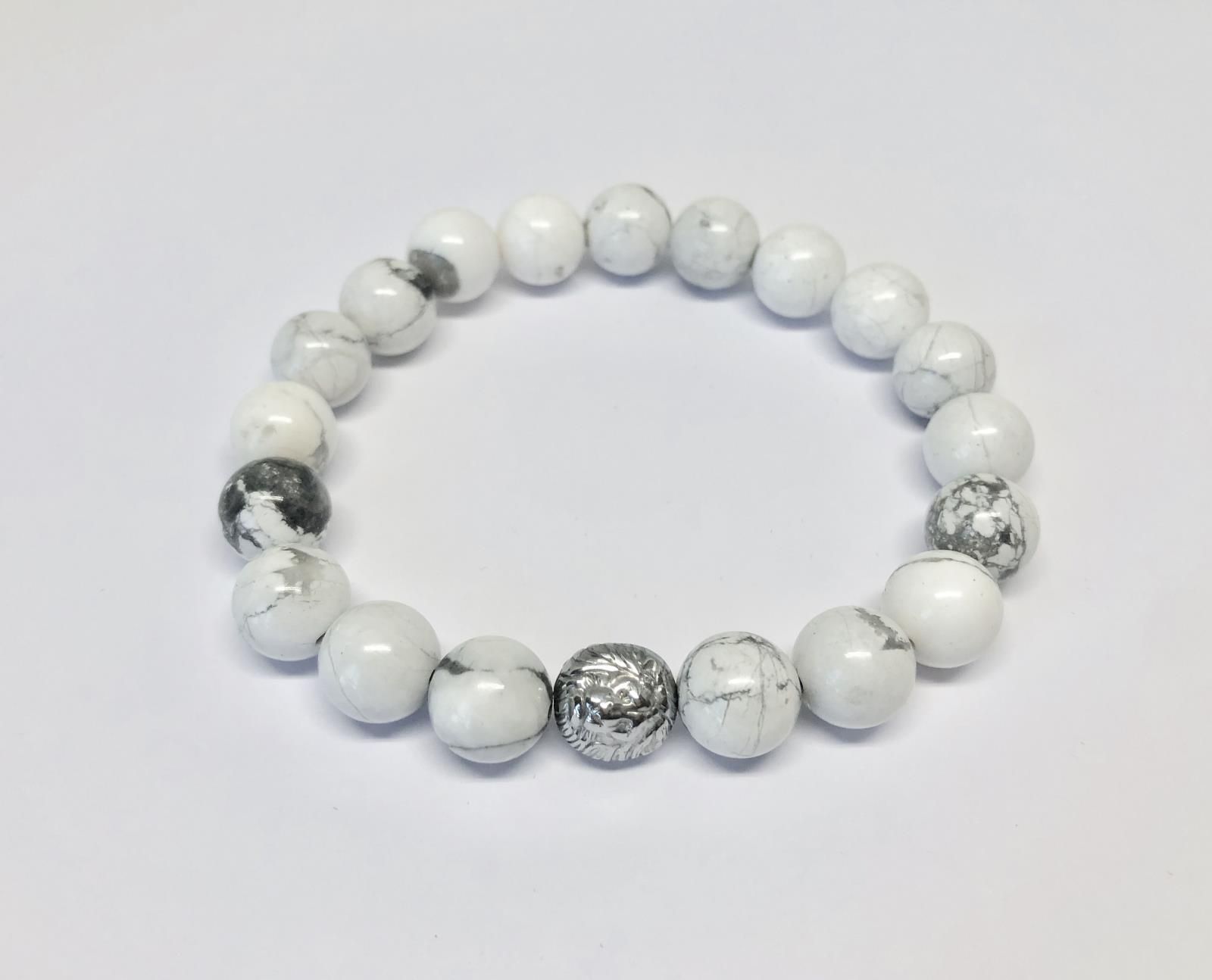 Bransoletka jest wykonana z kamieni półszlachetnych oraz hematytu, założonych na gumkę. Jest łatwa do założenia i zdejmowania. Pasuje do strojów eleganckich oraz sportowych. Świetnie się nadaje na prezent. Nie należy bać się dodatków. Męska bransoletka uzupełni stylizację i nada jej wyjątkowego charakteru. Bransoletka męska stwórz niepowtarzalny styl Bransoletkę można połączyć zarówno z eleganckim strojem jak i z casualową wygodą. Będzie świetnie pasowała do niebieskiej koszuli i wygodnych spodni typu chino. Najwyższa jakość: Kolekcja: For men Materiał: Biały howlit (kamień półszlachetny), gumka Dodatki: Hematyt Średnica kulek: 10 mm Dostępne rozmiary: XS (17 cm), S (18 cm), M (19 cm), L (20 cm), XL (21 cm)