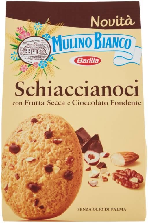 Mulino Bianco urodził się w latach 70-tych. Analizy i systematyczne badania nad produktami, kształtami, opakowaniami, nazwami trwały 3 lata. To marka, która „ze słodyczą” miała wejść do domów Włochów. Mulino Bianco rozpoczęło swoją przygodę od linii herbatników o nowym kształcie i smaku, z szacunkiem dla tradycji i autentyczności. Wkrótce do biszkoptów dołączyły przekąski, paluszki chlebowe, pieczywo, ciasta i słodycze. Dziś to jedna z najbardziej znanych marek włoskich słodyczy na świecie. Schiaccianoci to ciastka, które łączą w sobie energię z orzechów i smak gorzkiej czekolady. Jest to mieszanka starannie wyselekcjonowanych orzechów pekan, orzechów laskowych i migdałów. Idealnie nadają się jako przekąska w podrózy. SKŁADNIKI: mąka PSZENNA 55,3%, cukier, olej słonecznikowy, ORZECHY 7,2% ( ORZECHY LASKOWE 4%, ORZECHY PEKAN 2%, MIGDAŁY 1,2%), gorzka czekolada 6% (masa kakaowa, cukier, masło kakaowe, emulgator: lecytyna SOJOWA ), MASŁO , odtłuszczone MLEKO w proszku, świeże JAJA , miód, substancje spulchniające (wodorowęglan sodu, wodorowęglan amonu), sól, aromat wanilinowy. Może zawierać śladowe ilości ORZECHóW i SEZAMU. WARTOŚĆ ODŻYWCZA W 100 g PRODUKTU Wartość energetyczna 2031 kJ / 485 kcal Tłuszcz 22 g w tym tłuszcze nasycone 5,4 g Węglowodany 61,9 g w tym cukry 20 g Błonnik 3,8 g Białka 7,9 g Sól 0,450 g