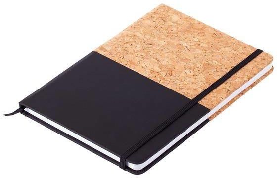 Stylowy notes w twardej oprawie łączącej naturalny korek z eleganckim PU. Budowa: Rozmiar biurkowy (zbliżony do A5 lub większy). 80 kartek w linie, gramatura papieru 70 g/m2. Zamykany elastyczną taśmą. Dostępna opcja zdobienia full color (druk UV) lub w rozmiarze XL.