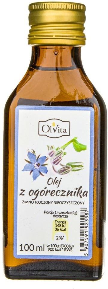 OlVita Olej z nasion ogórecznika tłoczony na zimno nieoczyszczony 100mlCeniony głównie ze względu na kojące działanie i pozytywny wpływ na błony śluzowe jamy ustnej, przełyku, żołądka i jelit. Wspiera pracę układu krążenia zapobiegając miażdżycy oraz wzmacnia układ odpornościowy. Olej z ogórecznika lekarskiego bogaty jest w NNKT – głównie kwasy omega-6 w tym 18-22g cennego kwasu gamma-linolenowego (GLA) oraz ok 18g omega-9. Olej z ogórecznika pozyskiwany jest poprzez tłoczenie na zimno nasion ogórecznika lekarskiego (Borago officinalis L.), który swoją nazwę zawdzięcza temu, że jego liście mają zapach i posmak ogórka. Nasiona natomiast, a tym samym olej z nich wytłoczony, nie posiadają już aromatów ogórka. Smak oleju jest bardzo delikatny. Olej z nasion ogórecznika – właściwościOlej z nasion ogórecznika wyróżnia się dużą zawartością nienasyconych kwasów tłuszczowych: kwasu linolowego i gamma-linolenowego, czyli GLA (18-22 g/100 g). Olej zawiera cenne substancje odżywcze, sole mineralne (m.in. krzemionka), witaminy, garbniki i flawonoidy, saponiny oraz pierwiastki śladowe takie jak magnez, potas, cynk i żelazo. Kwas gamma-linolenowy jest niezwykle cenny, gdyż wykazuje działanie: ochronne dla serca i układu krążenia; wzmacniające organizm; przeciwzapalne; przeciwreumatyczne. Olej z ogórecznika do picia polecany jest w przypadku: - Kłopotów trawiennych, gdyż dba o nabłonki układu pokarmowego, zmniejszając stany zapalne oraz wspomagając ich regenerację. - Działa kojąco i osłonowo na błony śluzowe żołądka. - Dba o jelita, tym samym wspierając pracę układu odpornościowego i poprawę odżywienia organizmu poprzez zwiększenie wchłaniania substancji odżywczych z pożywienia. - Wykazuje działanie moczopędne i wspomagające oczyszczanie organizmu z produktów przemiany materii, wspiera detoksykację organizmu. - Może obniżać gorączkę i pomagać w przypadku chorób układu oddechowego. - Łagodzi stany zapalne i dzięki temu wpływa na obniżenie wartości poziomu cholesterolu LDL we krwi oraz pośrednio działa na obniżenie ciśnienia krwi. - Zmniejsza agregację krwinek i ryzyko wystąpienia zakrzepów, przeciwdziała miażdżycy. - Wykazuje także działanie uspokajające, tym samym poprawia stan zdrowia przy lekkiej depresji i innych problemach psychicznych. Poprawia samopoczucie kobiet podczas menopauzy. - Usprawnia funkcje intelektualne przy wysiłku umysłowym. Jako ciekawostkę dodamy, że olej z ogórecznika zimnotłoczony znajduje również zastosowanie w diecie zwierząt domowych takich jak psy i koty. Poprawia kondycję ich sierści i skóry oraz zwalcza stany zapalne. Przechowywanie: Należy przechowywać go w chłodnym i ciemnym miejscu, a po otwarciu w lodówce. Profilaktycznie należy spożywać łyżeczkę dziennie przed posiłkiem. W kuchni znajduje zastosowanie jako dodatek do surówek i sałatek. Olej z ogórecznika lekarskiego w kosmetyce:- Olej z ogórecznika dzięki zawartości kwasów GLA, które są odpowiedzialne za kondycję skóry, wpływa na polepszenie jej wyglądu oraz zwalczanie dysfunkcji i infekcji. - Kwasy sprawiają, że olej z ogórecznika do twarzy jest jednym z najlepszych preparatów wspierających naszą skórę. - Wykazuje silne działanie antybakteryjne, przeciwzapalne i przeciwgrzybiczne. - Jest pomocny w takich schorzeniach jak trądzik, oparzenia, odmrożenia, owrzodzenia, wybroczyny, czyraki, trudno gojące się rany, świąd oraz łojotokowe zapalenie skóry. - Poprawia również jej elastyczność i redukuje zmarszczki. Kwasy te usprawniają też metabolizm kwasów tłuszczowych rzędu Omega-6 i Omega-3. - Olej z ogórecznika na włosy gwarantuje nawilżenie i odżywienie włosów. Nie ma obaw o ich przesuszanie i puszenie. - Wielonienasycone kwasy tłuszczowe są niezbędne dla zdrowia włosów, powodują ich wzmocnienie i minimalizują ryzyko wypadania. Przechowywanie: Należy przechowywać go w chłodnym i ciemnym miejscu, a po otwarciu w lodówce. Profilaktycznie należy spożywać łyżeczkę dziennie przed posiłkiem. W kuchni znajduje zastosowanie jako dodatek do surówek i sałatek. Opis produktu:Nierafinowany TAK Produkt zimnotłoczony TAK Nieoczyszczony TAK Kwasy nasycone w 100 g 15 gKwasy jednonienasycone w 100 g 27 g - w tym kwas oleinowy - Omega 9 18 g Kwasy wielonienasycone w 100 g 59 g - w tym kwas linolowy LA - Omega 6 37 g - w tym kwas gamma-linolenowy GLA 18-22 g Pojemność netto: 100 ml Producent: PPHU Maszyny i Przetwórstwo Nasion Oleistych Olvita Dziaduch Krzysztof Panków 2 58-125 Pszenno