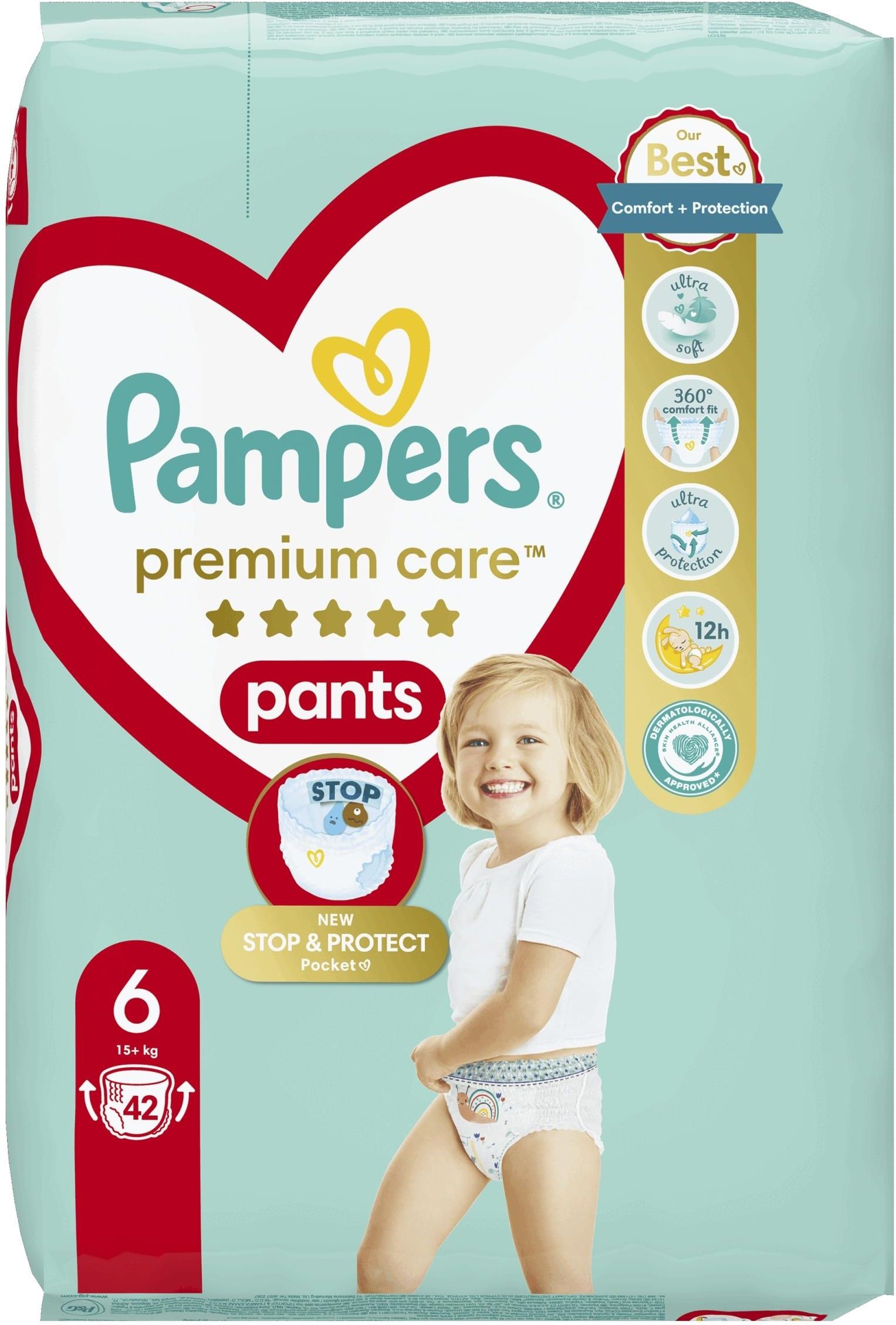 Pampers Premium Care Pants Pieluchomajtki, rozmiar 6, 42 szt, 15kg+ Najlepszy komfort i ochrona od Pampers Im bardziej aktywne staje się Twoje dziecko, tym ważniejsze jest zapewnienie mu elastycznych pieluszek, które gwarantują komfortowe dopasowanie i niezawodną ochronę. Właśnie dlatego stworzyliśmy Pampers Premium Care Pants - pieluchomajtki zapewniające najwyższy komfort i najlepszą ochronę Pampers, za sprawą pełnego dopasowania 360° uzyskiwanego dzięki zastosowaniu wyjątkowo miękkich i elastycznych materiałów, które dopasowują się do kształtu ciała aktywnego maluszka. Podobnie jak wszystkie pieluchomajtki Pampers, Pampers Premium łatwo się zmienia. Wystarczy jeden ruch, aby je założyć, nawet gdy dziecko się wierci. Aby zdjąć pieluchomajtki, musisz tylko rozedrzeć boczki, a przed wyrzuceniem pieluchomajtek zwinąć je i zabezpieczyć taśmą. Kieszonka stop & protect pomaga zapobiegać przeciekaniu z tyłu Podaruj swojemu dziecku najwyższy komfort i najlepszą ochronę Pampers dzięki pieluchomajtkom Pampers Premium Care Pants. Teraz ze specjalną kieszonką Stop & Protect, która zapobiega przeciekaniu pieluchomajtek z tyłu, zapewniając pełną ochronę nawet do 12 godzin. Najlepszy komfort i ochrona od Pampers dzięki niezwykle miękkim, elastycznym materiałom Pieluchomajtki z 360° Comfort Fit mają elastyczną taśmę wokół talii, która dopasowuje się do kształtu ciała maluszka i pomaga zapobiegać przeciekaniu Wskaźnik wilgotności, który poinformuje Cię o konieczności zmiany pieluszki Zatwierdzone przez dermatologów z organizacji Skin Health Alliance, co potwierdza ich bezpieczeństwo dla skóry dzieci Jak używać Pampers Premium Care Pants Elastyczna taśma wokół talii ułatwia zmianę pieluchomajtek. Wystarczy jeden ruch, aby je założyć, a urocze obrazki sprawią, że przewijanie stanie się dobrą zabawą. Łatwe zdejmowanie Wystarczy rozedrzeć boczki Łatwe zwijanie Zwiń pieluszkę i zabezpiecz ją taśmą Składniki: Petrolatum, Stearyl Alcohol, Paraffinum Liquidum, Aloe Barbadensis Leaf Extract