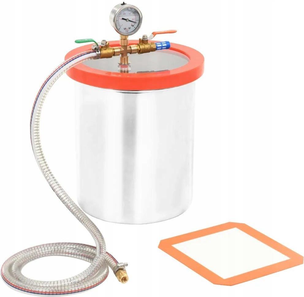 Ta wytrzymała pompa próżniowa ze stali nierdzewnej będzie idealnym wyborem do odgazowania, hermetyzacji próżniowej i tym podobnych. Zbiornik został dobrze uszczelniony, by zapobiec wyciekom i zapewnić bezpieczne, niezawodne narzędzie do odgazowania. Wykonanie ze stali nierdzewnej zapewnia odporność na zużycie i ciśnienie. Dodatkowo, wyjątkowo gruba, przezroczysta akrylowa pokrywa, odporna na wygięcia podczas operacji próżniowych, umożliwia lepszą obserwację całego procesu. Poza tym urządzenie wyposażono w silikonowy miernik oleju i odporny na wstrząsy wskaźnik do mierzenia próżni. Stalowy wąż również może wytrzymać duże ciśnienie. Materiał komory: stal nierdzewna Materiał pokrywy: akryl Wymiary: 24,5 x 27 cm (śr. x wys.) Grubość ścianki: 1 mm Podłączenie pompy próżniowej: 1/4 cala Pojemność: 11,42 L