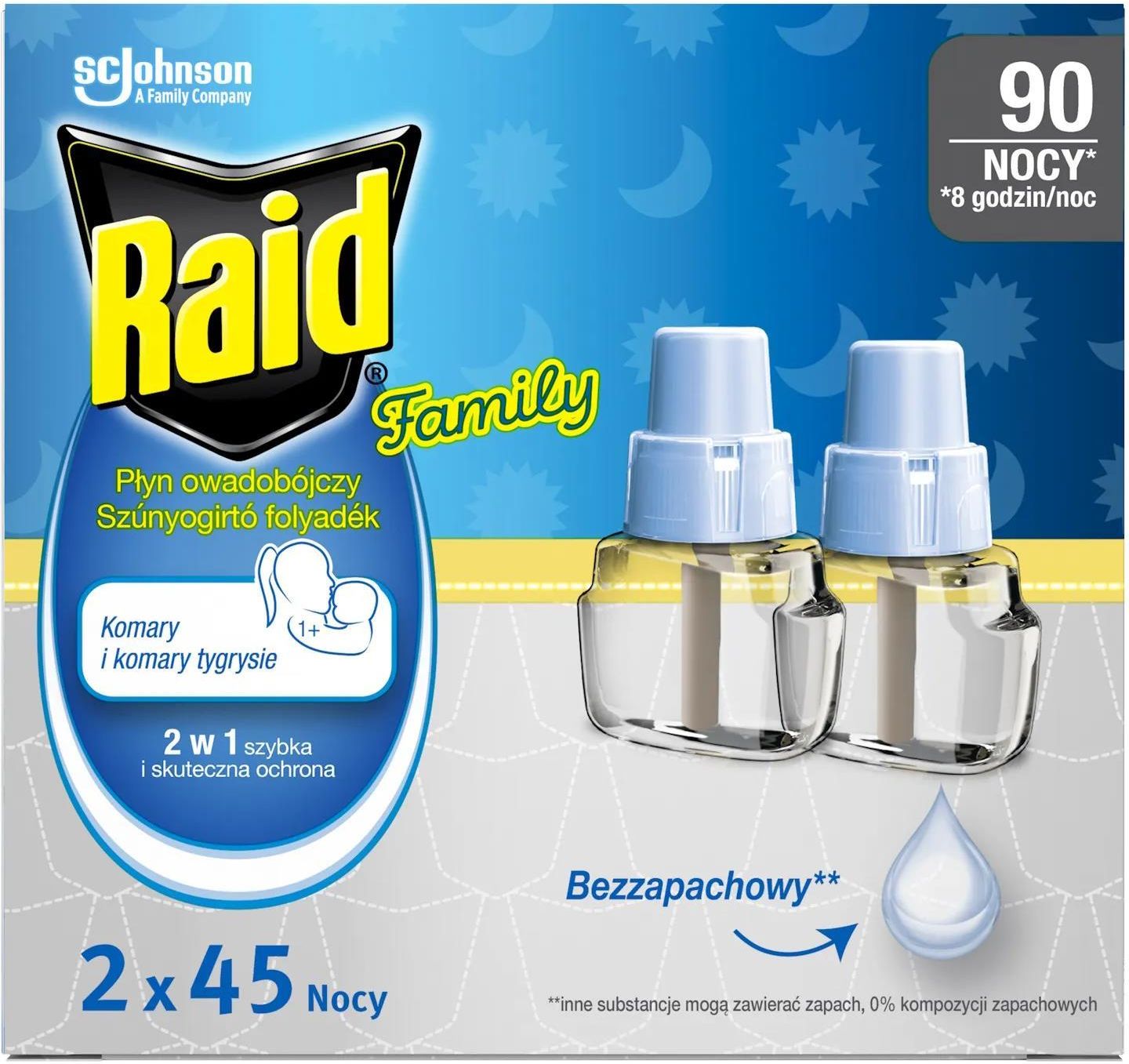 Produkt Raid Family, płyn owadobójczy przeciw komarom, zapas, 2 x 27 ml do kupienia w Gemini. Bezzapachowy płyn owadobójczy przeciw komarom do elektrofumigatora Raid® Family to preparat biobójczy, który zabezpiecza ...