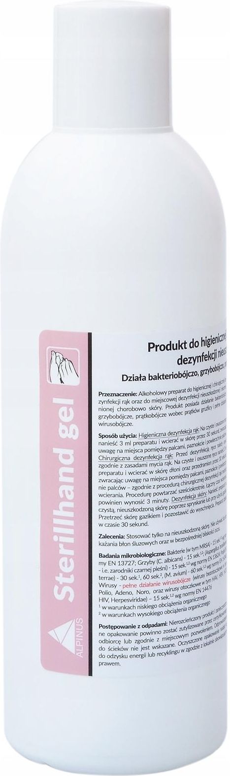STERILLHAND GEL 250 ML Sterillhand - Żel do higienicznej dezynfekcji rąk 250 ml Sterillhand to gotowy do użycia preparat alkoholowy przeznaczony do higienicznej i chirurgicznej dezynfekcji rąk oraz dezynfekcji skóry. Idealny do miejsc wymagających zachowania najwyższych standardów higieny, takich jak placówki służby zdrowia, salony kosmetyczne, siłownie, kluby fitness czy placówki edukacyjne. Preparat działa natychmiastowo, zapewniając skuteczność w walce z bakteriami, grzybami, prątkami i wirusami. Główne zalety produktu: Gotowy do użycia: Nie wymaga rozcieńczania. Skuteczność: Natychmiastowe działanie na bakterie, grzyby, prątki i wirusy. Bezpieczny dla skóry: Zawiera substancje chroniące skórę przed wysuszeniem, przebadany dermatologicznie. Wielozadaniowy: Do higienicznej dezynfekcji rąk, chirurgicznej dezynfekcji rąk i dezynfekcji skóry. Łatwa aplikacja: Wygodna forma żelu o pojemności 250 ml, idealna do codziennego użytku. Substancje czynne: Etanol: 72 g/100 g produktu (alkohol etylowy denaturowany, nie przeznaczony do konsumpcji). Skuteczność potwierdzona badaniami mikrobiologicznymi: Bakterie (w tym MRSA): 15 sekund. Grzyby (Candida albicans): 15 sekund. Zarodniki czarnej pleśni (Aspergillus brasiliensis): 15 sekund. Prątki (Mycobacterium terrae, Mycobacterium avium): 60 sekund. Wirusy: Pełne działanie wirusobójcze (w tym Polio, Adeno, Noro, HAV, HBV, HCV, HIV, Herpesviridae): 15 sekund. Jak stosować Sterillhand? Higieniczna dezynfekcja rąk: Na czyste i osuszone dłonie nanieś 3 ml preparatu i wcieraj przez 30 sekund, zwracając uwagę na miejsca między palcami, paznokcie i powierzchnie palców. Chirurgiczna dezynfekcja rąk: Na czyste i osuszone dłonie oraz przedramiona nanieś 3 ml preparatu i wcieraj przez 30 sekund, zgodnie z procedurą chirurgicznej dezynfekcji rąk metodą wcierania. Dezynfekcja skóry: Nanieś preparat na czystą, nieuszkodzoną skórę poprzez spryskanie lub przy użyciu gazika. Przetrzyj skórę i pozostaw do wyschnięcia (czas działania: 30 sekund). Uwaga: Produkt biobójczy. Przed użyciem należy zapoznać się z etykietą i informacjami dotyczącymi stosowania. Używaj z zachowaniem środków ostrożności.
