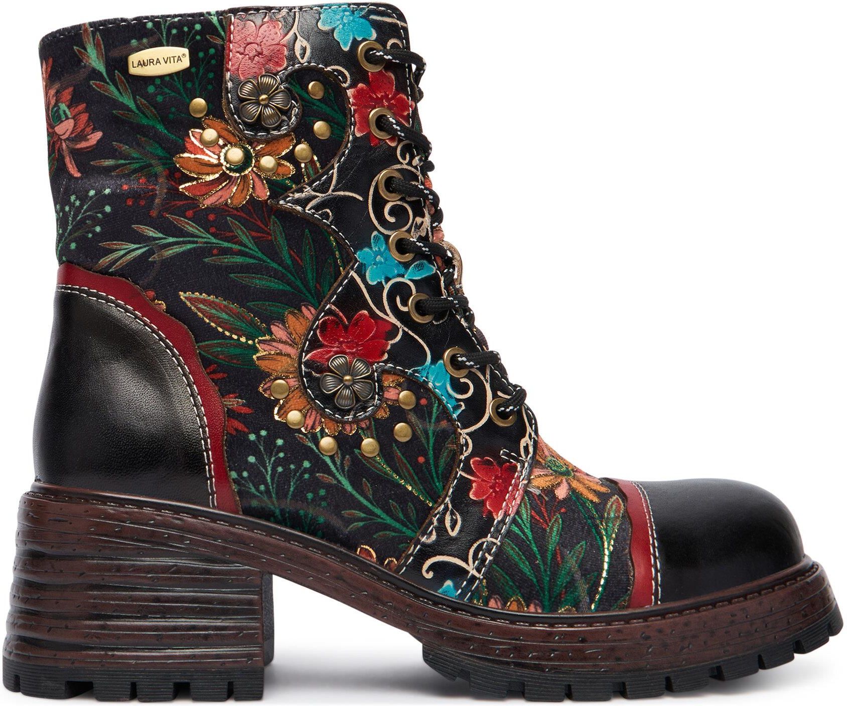 Botki damskie skórzane workery Laura Vita KLEO 02 NOIR platforma czarne 39 Płeć: Damskie Kolor: Czarny Wysokość: Wysokie Materiał: Skóra naturalna, Tkanina Podeszwa: Wysokogatunkowe tworzywo Rodzaj zapięcia: Suwaki, Sznurowadła Dodatkowe informacje: Sztywny zapiętek, Wkładka skórzana Stan: Nowy Botki damskie skórzane Laura Vita KLEO 02 NOIR Kolor: Czarny Botki damskie francuskiej marki Laura Vita cechuje niepowtarzalne wzornictwo oraz stylistyka. Są nie tylko oryginalne ale też bardzo wygodne. Cholewka butów została wykonana z wysokogatunkowej skóry naturalnej połączonej z ozdobnym, welurowym materiałem. Część skóry na cholewce posiada wytłoczony motyw kwiatowy, co daje niesamowity efekt. Wnętrze buta lekko ocieplone miękką, pluszową tkaniną. Gruba podeszwa z głębokim bieżnikiem zwiększa stabilność oraz przyczepność do podłoża. Miękka wkładka z naturalnej skóry sprawia, że buty gwarantują wygodę podczas chodzenia. Boczne zapięcie na suwak umożliwia szybkie i łatwe zakładanie butów. Nowe botki Laura Vita łącza w sobie nie tylko styl ale również wygodę. Doskonale pasują do casualowych spodni w różnych stylach, ale również do stylizacji z udziałem spódnic lub sukienek. Rozmiar i dł. wkładki wewnętrznej Wymiary , granica błędu 1-2mm 36 - 23,5 cm 37 - 24,0 cm 38 - 24,5 cm 39 - 25,3 cm 40 - 26,0 cm 41 - 26,5 cm