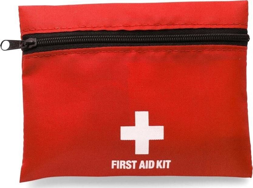 Apteczka w pokrowcu Budowa: pęseta, rolka plastra, bandaż w rolce, 2 jałowe opatrunki, chusteczka nasączona alkoholem, chusteczka przeciw komarom, wacik antyseptyczny, nożyczki