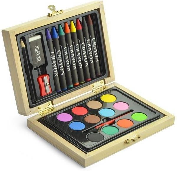 Zestaw malarski UPOMINKARNIA PAINTER Beżowy Budowa Praktyczny zestaw dla dzieci w drewnianym pudełku. Zawiera: ołówek, gumkę, temperówkę, kredki i farbki z pędzelkiem. Logo wygrawerujemy na pudełku.