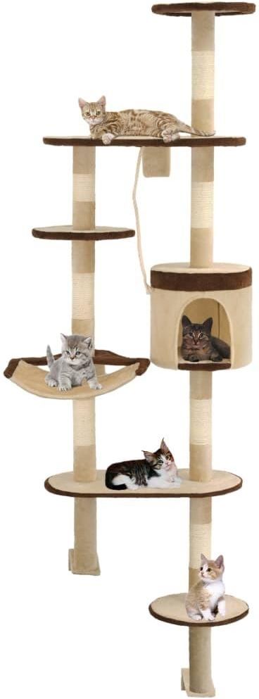 Wysokiej jakości naścienny drapak pozwoli kotom na drapanie, wspinanie się, wylegiwanie i odpoczynek, ku ich pełnemu zadowoleniu. Będzie pasował do każdego wystroju wnętrza. Drapak oferuje także Twoim czworonogom możliwość przeciągania się i ćwiczeń, co jest szczególnie ważne podczas zimowych miesięcy, gdy większość czasu spędzają w domu. Pokryte pluszem i owinięte sizalowym sznurkiem słupki drapaka pozwolą Twoim futrzakom ostrzyć pazurki. Koty będą cieszyć się wspólną zabawą, pościgami i skokami, przemierzając swój plac zabaw w górę i w dół. Nasz drapak posiada przytulny domek i legowisko, w którym kot może zdrzemnąć się lub odpocząć. Wyposażono go także w platformy widokowe i strefy relaksu, aby zapewnić rozrywki Twojemu pupilowi. Drapak można łatwo zamontować na ścianie, gdzie będzie stabilny i mocny. Dzięki takiemu montażowi drapaka możesz zaoszczędzić dużo miejsca w domu! Kolor: beżowo-brązowy Materiał: rama z płyty wiórowej + miękki plusz + sizalowy sznurek Wysokość: 194 cm Wymiary podstawy: 60 x 30 cm (dł. x szer.) Średnica słupka: 7 cm Z legowiskiem, wygodnym domkiem, platformami i miejscami do relaksu Materiał: Poliester: 100%