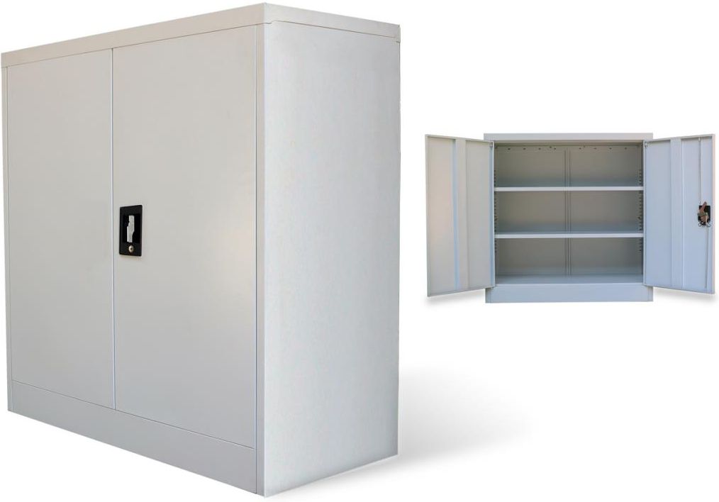 VidaXL Szafa biurowa z 2 drzwiami, szara, 90 cm, stalowa vidaXL Kolor: Szary Rozmiar: 90 x 40 x 90 cm Ta szafa biurowa o prostej lecz stylowej formie będzie idealna do zorganizowania i przechowywania Twoich dokumentów i innych rzeczy biurowych. Ponadto będzie to znakomity element dekoracyjny do biura. Szafa biurowa ma 2 przestawne półki i zapewnia mnóstwo miejsca do przechowywania. Dzięki swojej klasycznej formie wpasuje się ona w dowolny wystrój biura. Jest ona wykonana ze stali, co czyni ją nie tylko mocną, ale także łatwą w czyszczeniu i utrzymaniu. Montaż jest bardzo łatwy. Wszystkie akcesoria są dołączone do przesyłki. Kolor: szary Materiał: stal Wymiary: 90 x 40 x 90 cm (szer. x gł. x wys.) 2 drzwi i 2 przestawne półki 2-skrzydłowe drzwi o kącie otwierania wynoszącym 130° Maksymalne obciążenie każdej z półek: 30 kg Trzypunktowy system zamykania Prosty montaż OSTRZEŻENIE: aby zapobiec przewróceniu się produktu, musi on zostać przymocowany do ściany za pomocą dołączonego elementu montażowego Legal Documents:Więcej informacji na temat zabezpieczenia mebli przed przewróceniem można znaleźć tutaj
