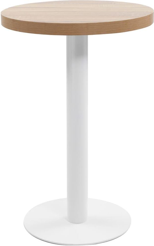 Stwórz romantyczną atmosferę dzięki naszemu eleganckiemu stolikowi bistro. Blat wykonano z MDF z wykończeniem o widocznych słojach oraz podparto na stalowej nodze i podstawie. Łatwo go wyczyścić za pomocą wilgotnej ściereczki. Wstaw go jako pojedynczy element w swoim wnętrzu, w restauracji, kawiarni lub barze. Montaż produktu jest prosty. Kolor: jasnobrązowy i biały Materiał: MDF, stal Wymiary całkowite: 50 x 75 cm (śr. x wys.) Grubość blatu: 3,8 cm Ilość miejsc: 2 Wymagany montaż: tak
