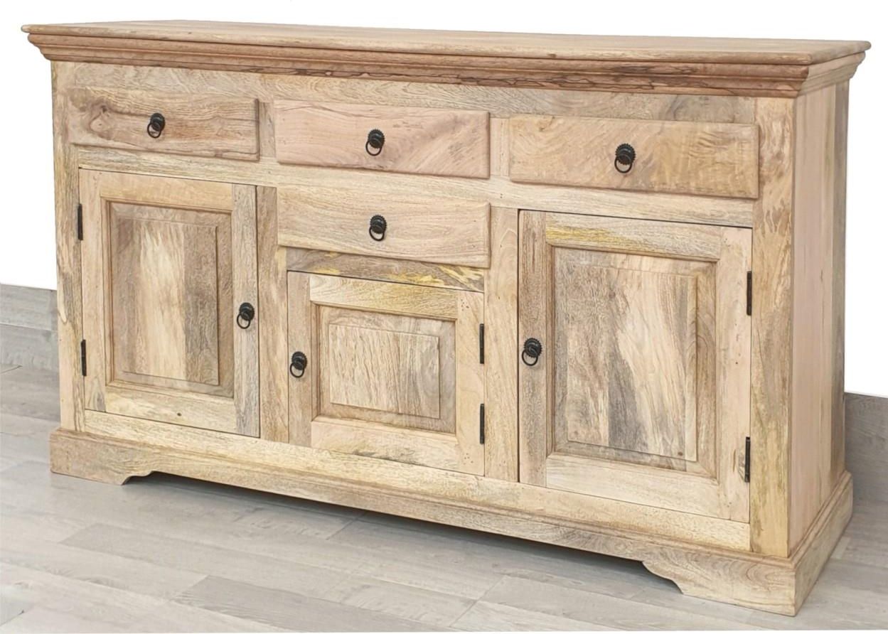 Szerokość: 150 cm/ Głębokość: 45 cm/ Wysokość: 85 cm/ Drewniana komoda w naturalnym kolorze drewna mango Cechy mebla: * komoda do przechowywania o wymiarach 150 x 45 x 85 cm * 4 szuflady, 3 zamykane szafki z półkami * niklowane uchwyty w wykończeniu satynowym * duża powierzchnia przechowywania * …