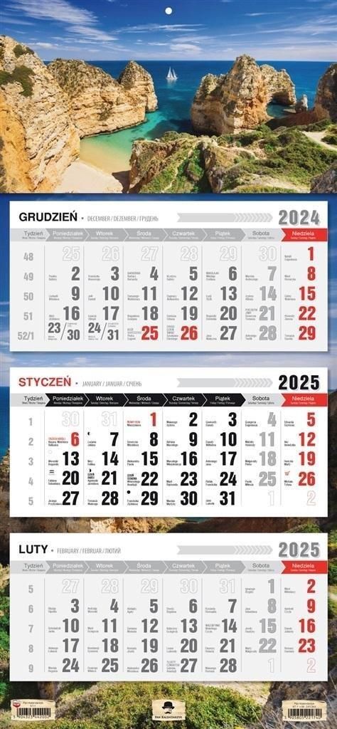 KALENDARZ TRÓJDZIELNY 2025 WYMIARY KALENDARZA: ok. 68 cm x 31,5 cm układ: 3 miesiące na stronie (miesiąc bieżący, poprzedni i następny) w oddzielnych bloczkach. bardzo wyraźna i czytelna czcionka imieniny, święta pasek z okienkiem do zaznaczania bieżącej daty płaska główka z nadrukowanym wzorem wzór główki rozciągnięty na tło (plecki) kalendarza - daje to bardzo dekoracyjny efekt otwór ułatwiający zamocowanie kalendarza Każdy wzór jest wystawiony na oddzielnej aukcji. Przy zakupie różnych kalendarzy prosimy dodawać do koszyka konkretne wzory i opłacać zbiorczo z poziomu koszyka. Widzimy wtedy Państwa wybór i nie trzeba się męczyć z próbą opisania wybranego wzoru :) Rzeczywiste kolory kalendarzy mogą się nieco różnić od widocznych na zdjeciach. Zależy to także od ustawień Państwa monitora/wyświetlacza.
