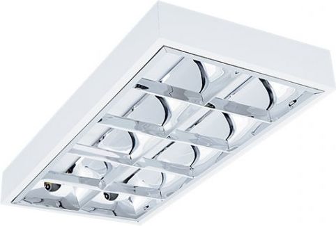 KANLUX MILEDO OPRAWA RASTROWA NATYNK RSTR 2X18 EVG Montaż: natynkowy (na suficie) Źródło światła: 2 × świetlówka typu T8, trzonek G13 Moc maksymalna: 2 × 18 W Zasilanie: 220–240 V AC, 50/60 Hz Układ zapłonowy: elektroniczny statecznik (EVG), zimny start Obudowa: stal malowana proszkowo – kolor biały Odbłyśnik: wysoki połysk, półparaboliczny kształt, poprzeczki rastra w kształcie litery V Estetyczne detale: gniazda świetlówek zamaskowane odbłyśnikiem, łatwy montaż rastra na zaczepach sprężynujących Okablowanie: przyłącze za pomocą kostki śrubowej, zakres przewodów 1–2,5 mm² Stopień ochrony: IP20 (ochrona przed dotykiem, bez zabezpieczenia przed wilgocią) Klasa ochronności: I (uziemienie wymagane) Ochrona przed przegrzewaniem: nie nadaje się do mokrych stref Wymiary: długość 610 mm, szerokość 298 mm, wysokość 68 mm Waga: ok. 1,3 kg Minimalna odległość od oświetlanego obiektu: ≥ 0,5 m Przeznaczenie: wnętrza biurowe, sklepy, magazyny, korytarze – wszędzie tam, gdzie liczy się dobry komfort świetlny i